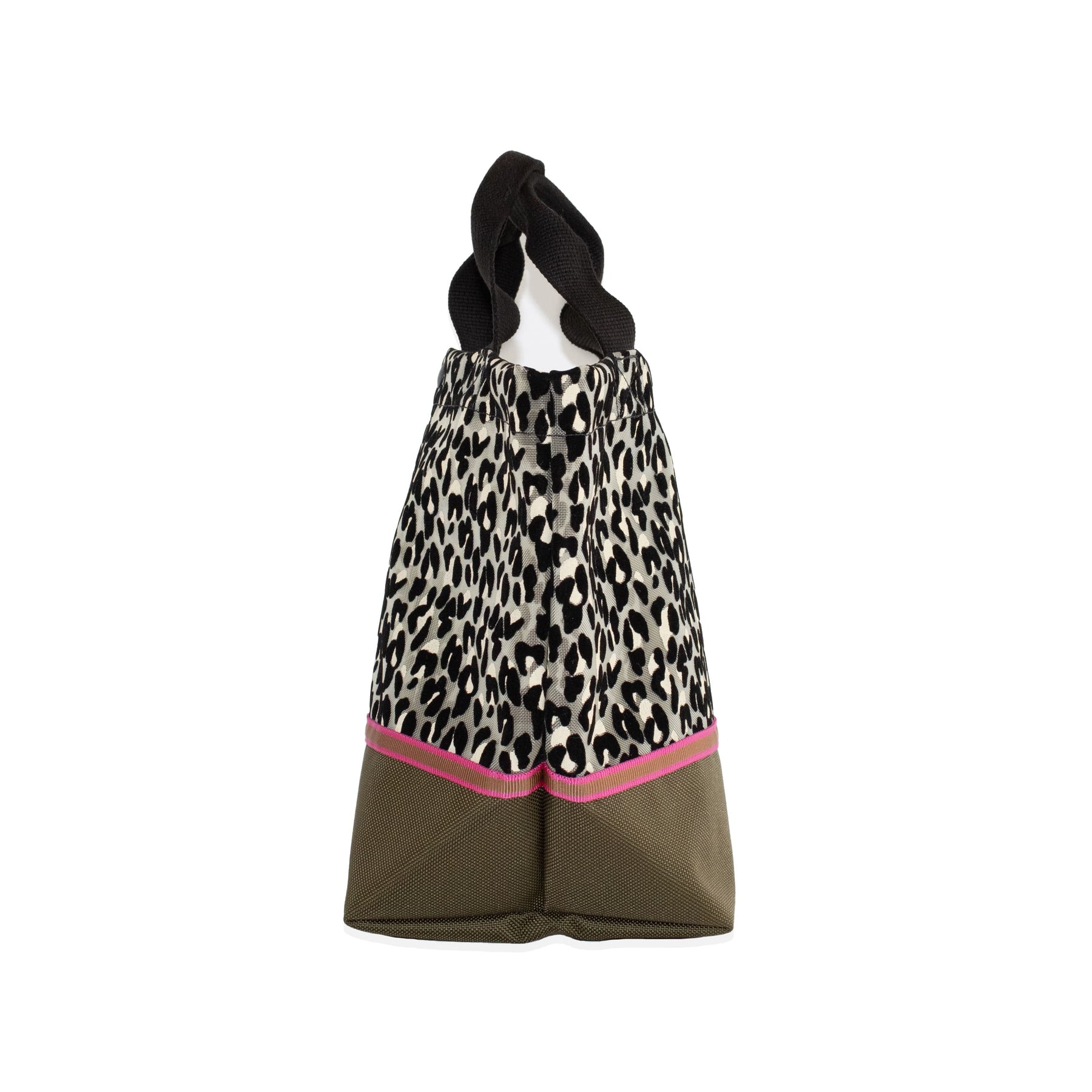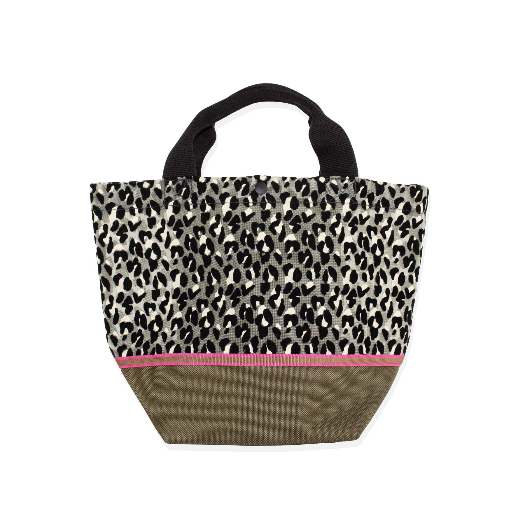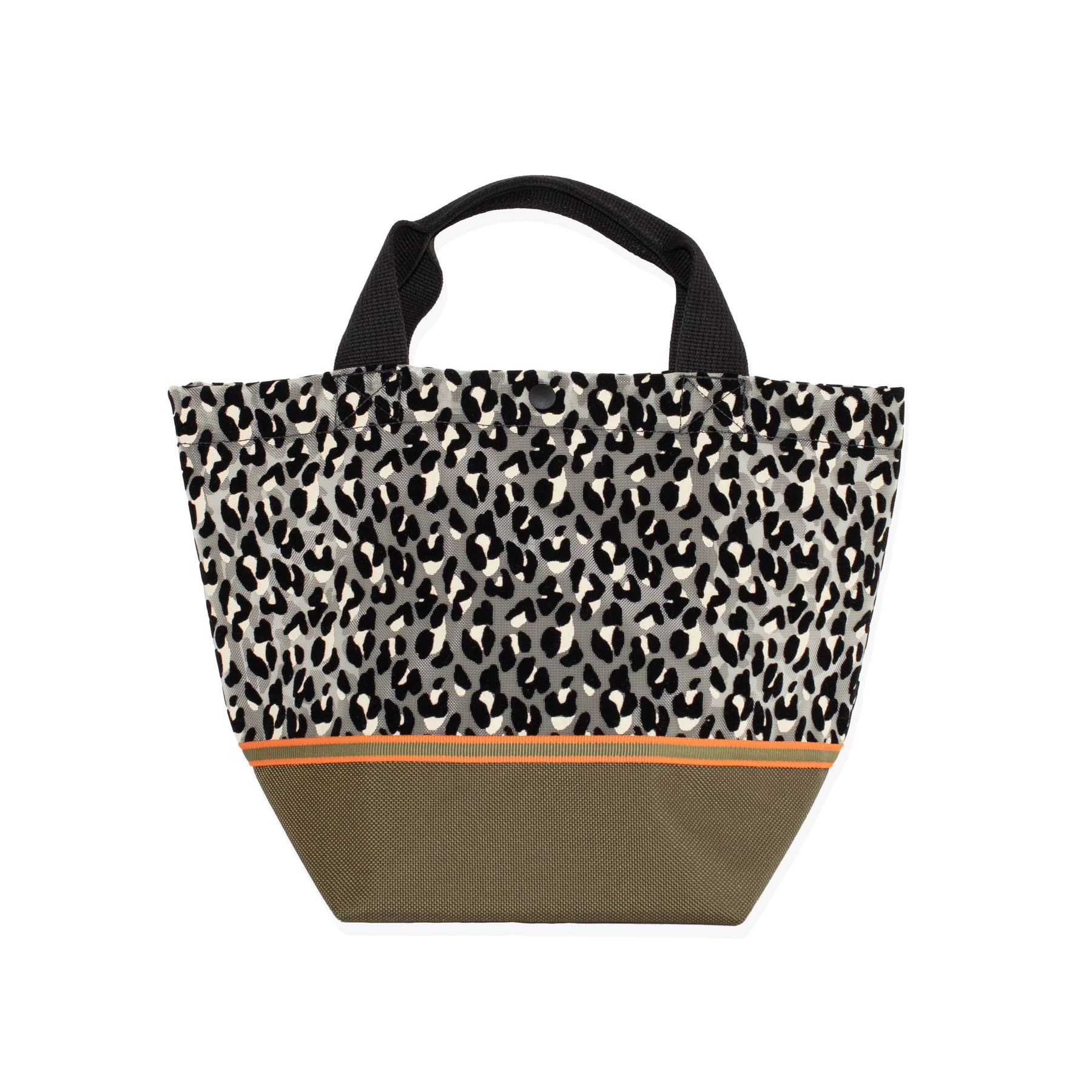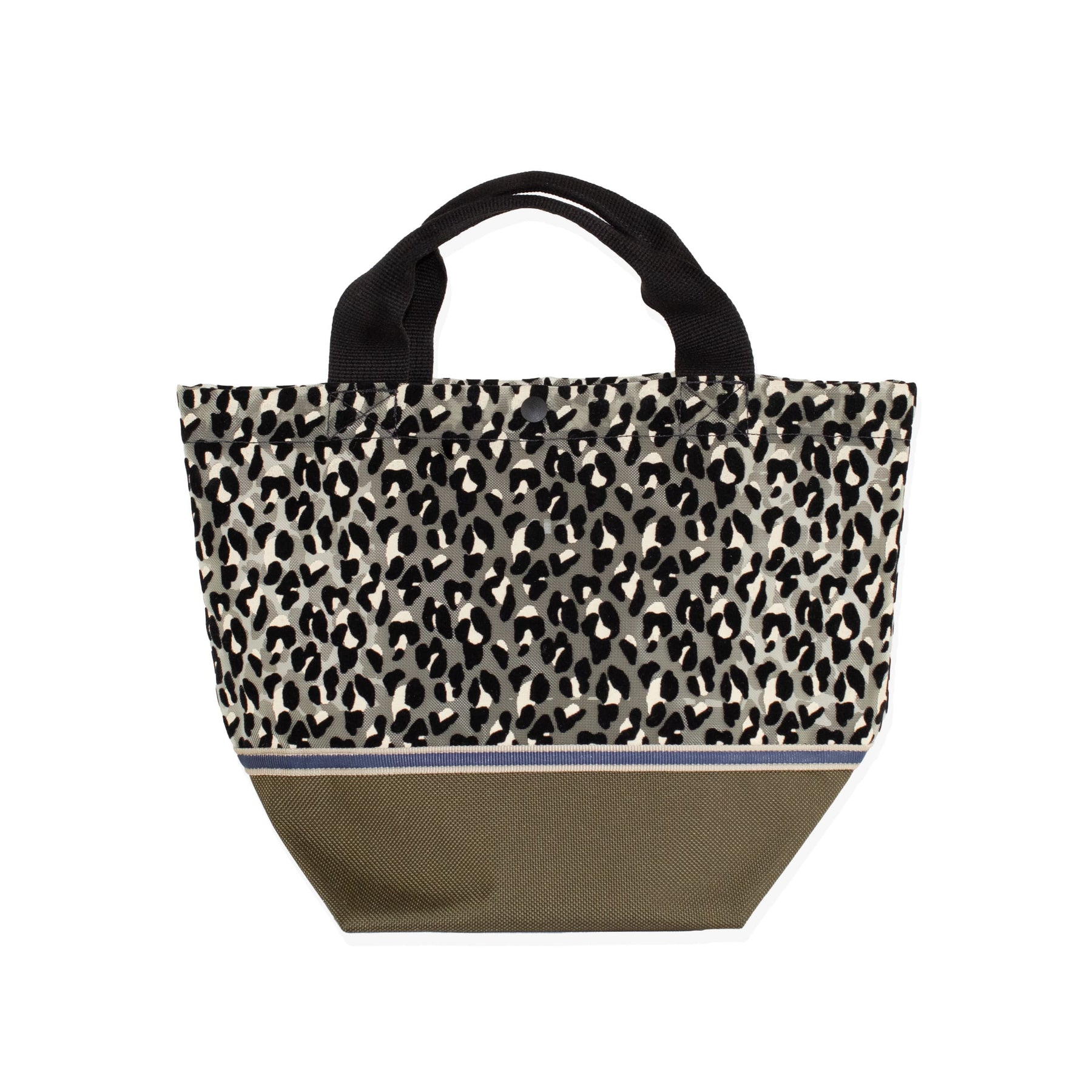 レオパードのデザインと水平線のような直線ラインが目を引きます。軽くて使いやすくマルチに活用できるトートバッグです。使用されている生地には専門職人による国産生地、京都手捺染フロッキーを使用。