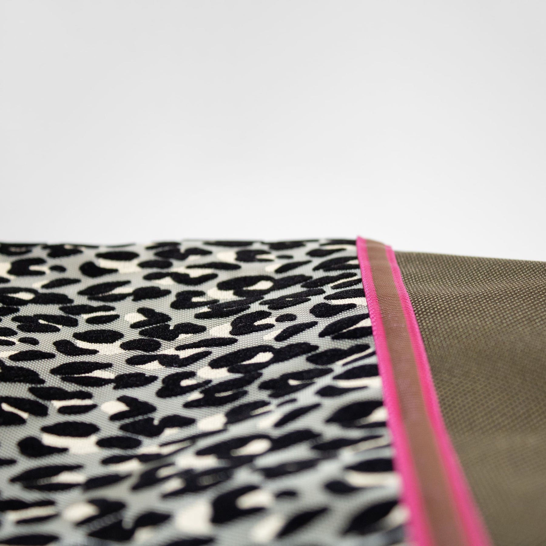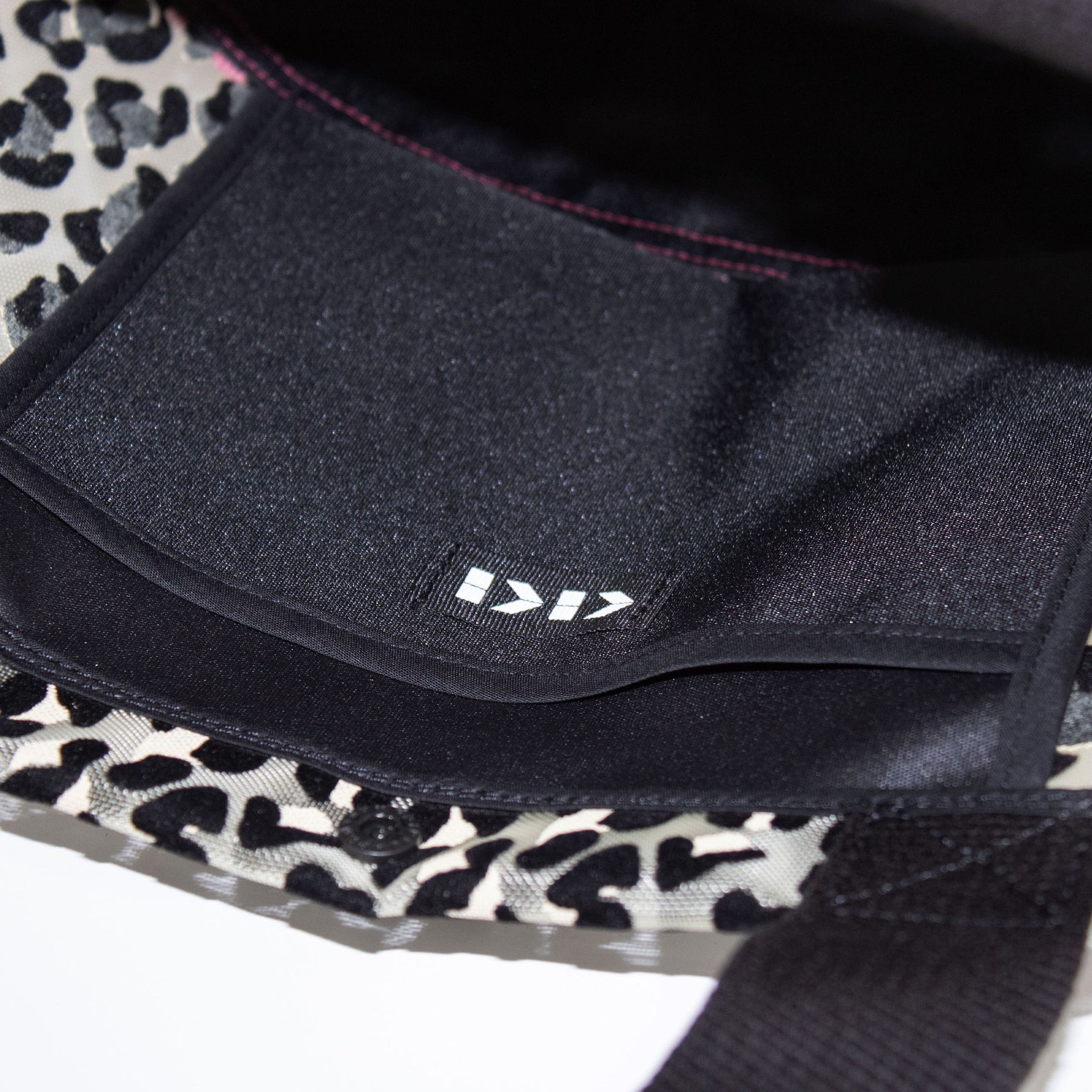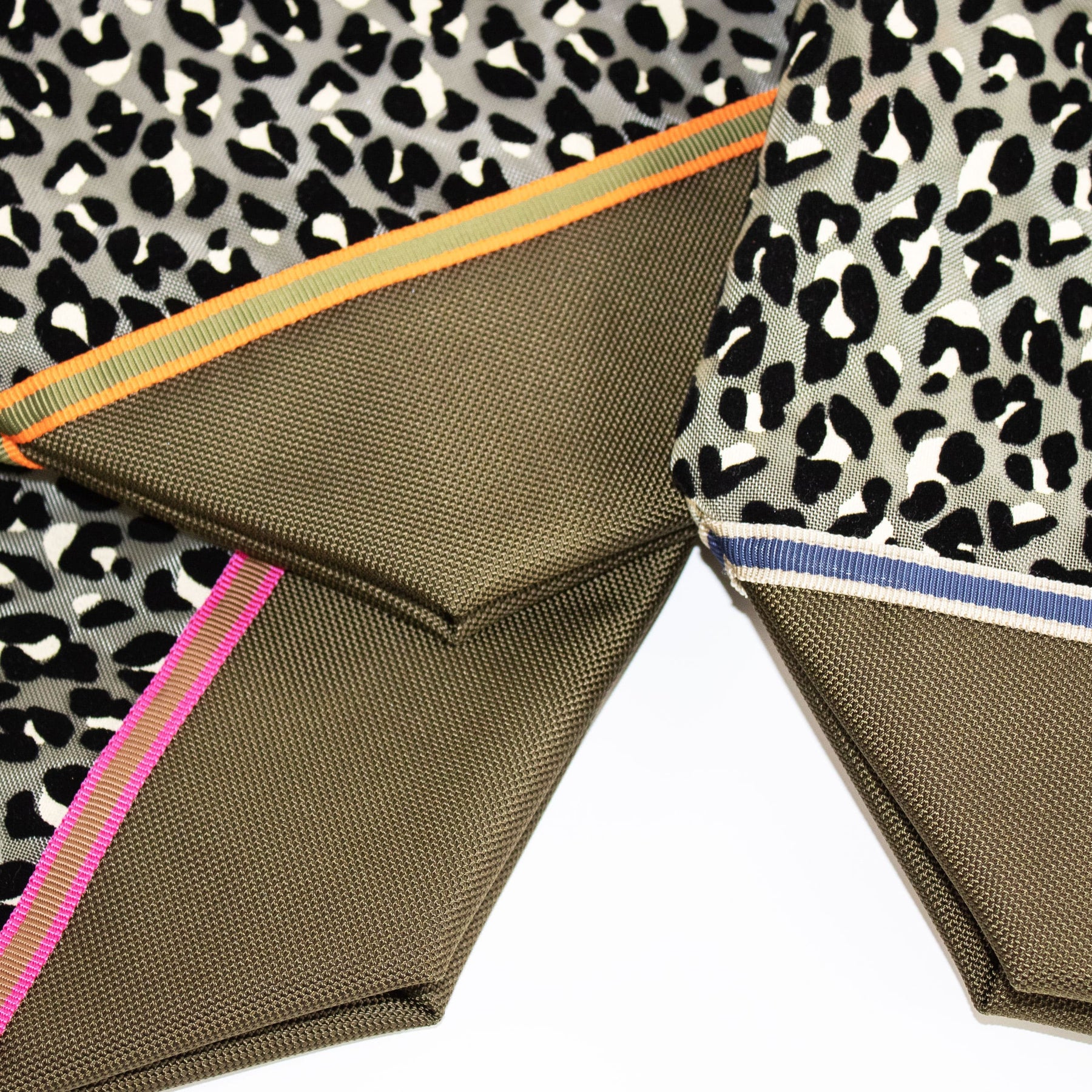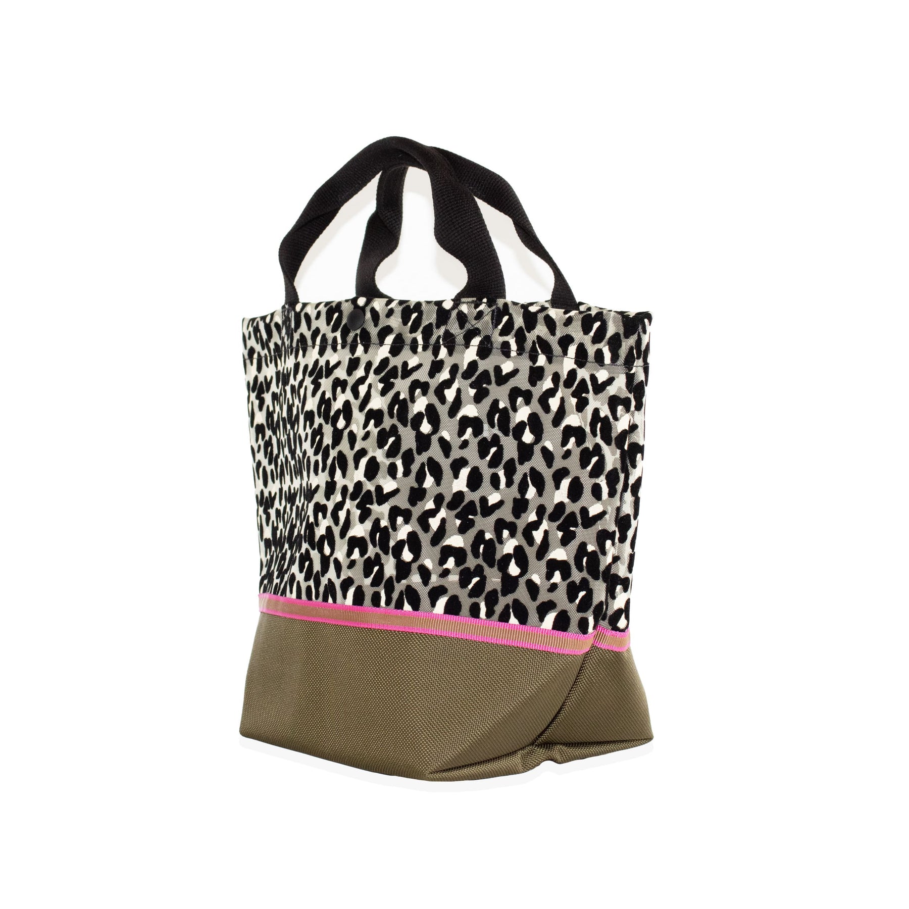 レオパードのデザインと水平線のような直線ラインが目を引きます。軽くて使いやすくマルチに活用できるトートバッグです。使用されている生地には専門職人による国産生地、京都手捺染フロッキーを使用。