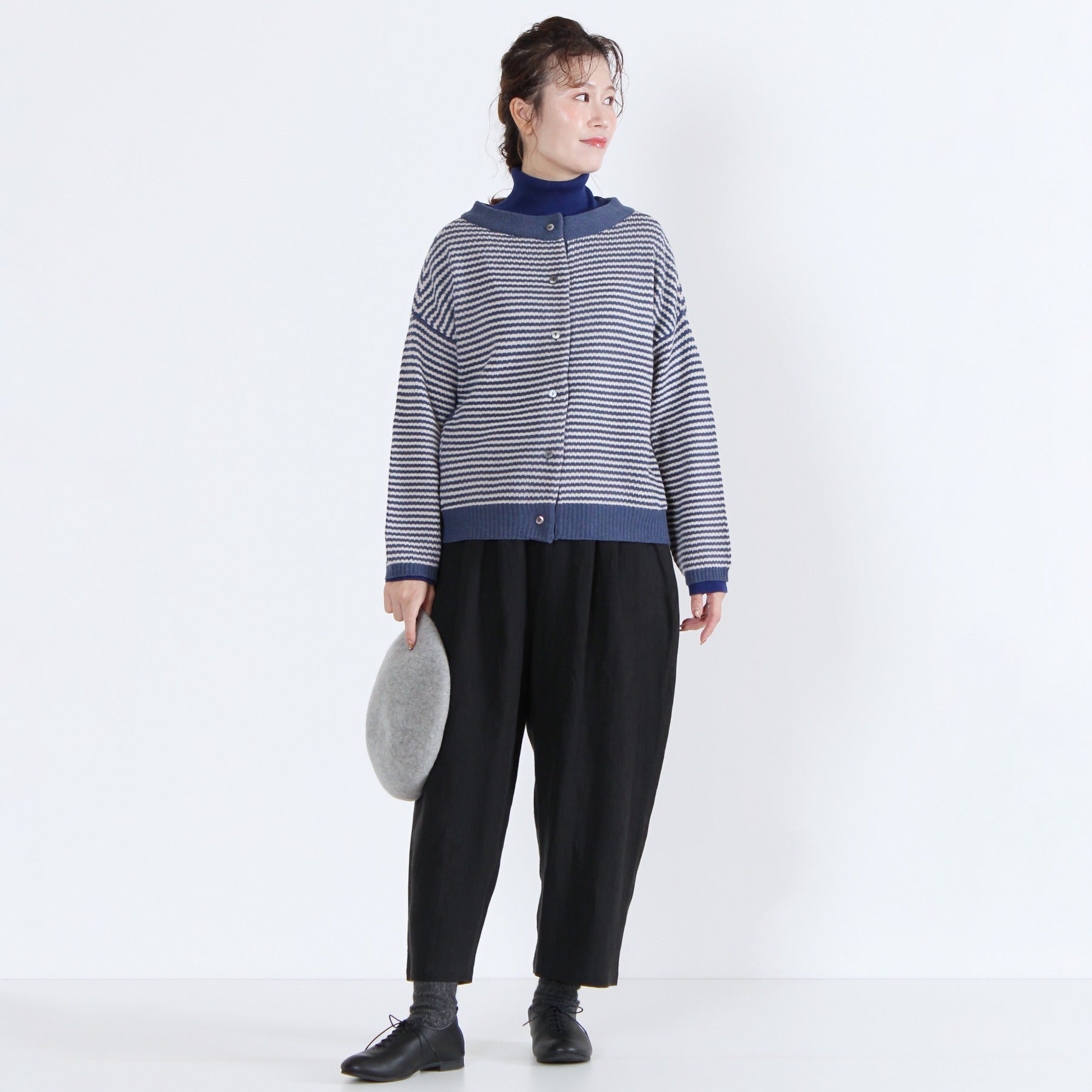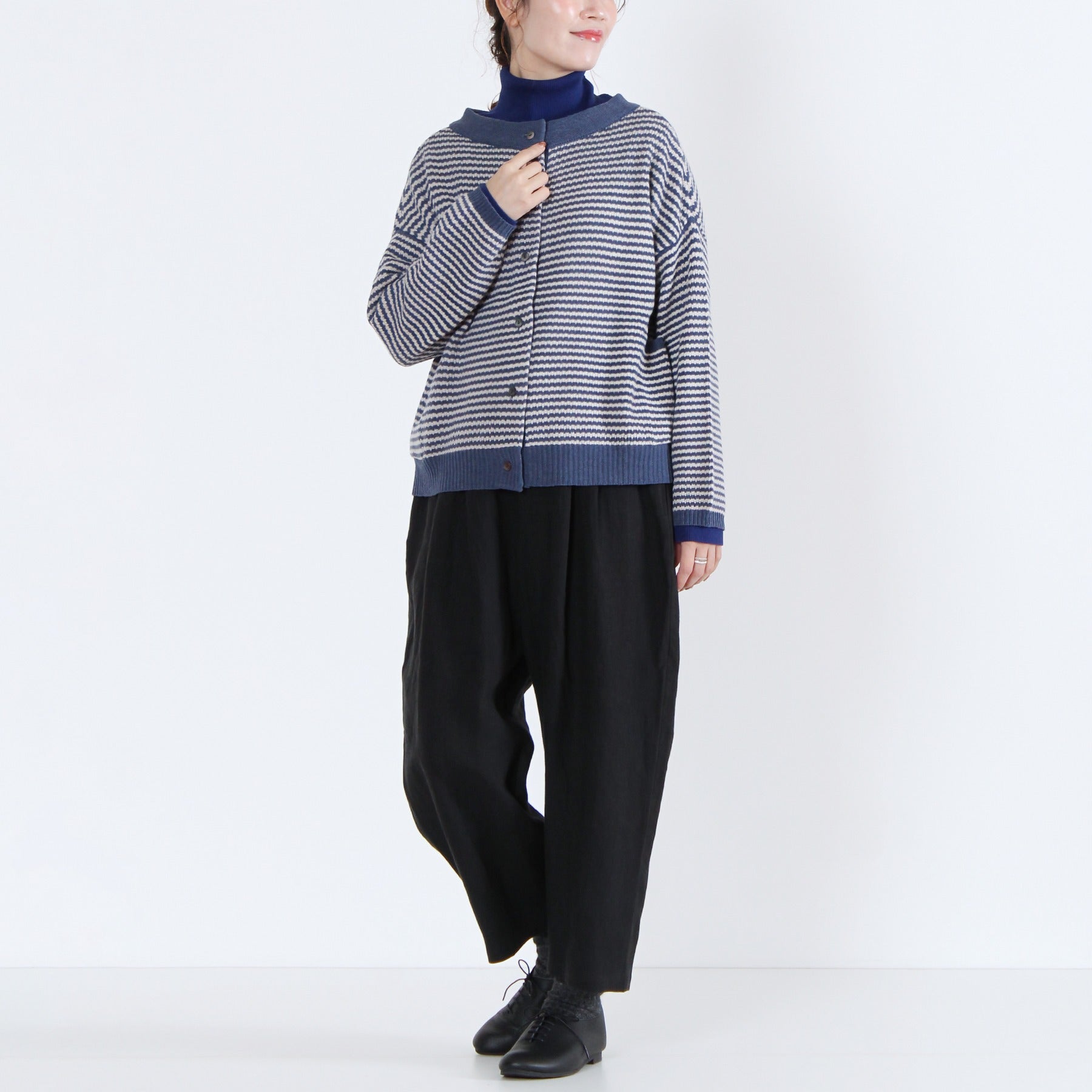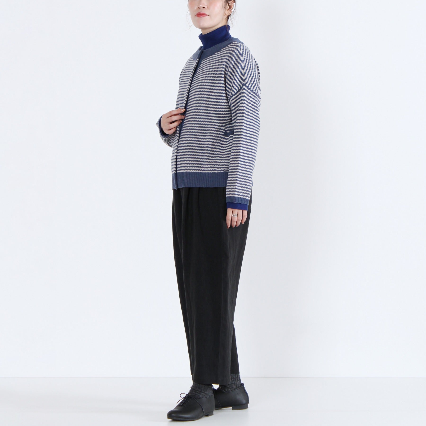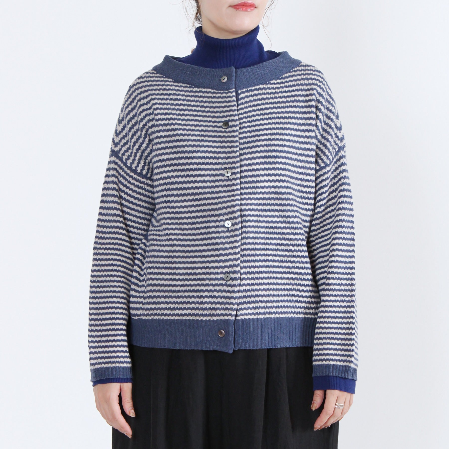 上質なイタリー糸で編み上げた、2WAY仕様のニットカーディガン。柔らかくしなやかな素材感で、季節の変わり目にも軽く羽織るだけで品のある印象を演出します。前後どちらでも着られるデザインと左右のパッチポケットが機能性とデザイン性を兼備。無地カラーと細ボーダーの多彩なカラーバリエーションで、ベーシックからアクセントまで幅広く選べる定番アイテムです。