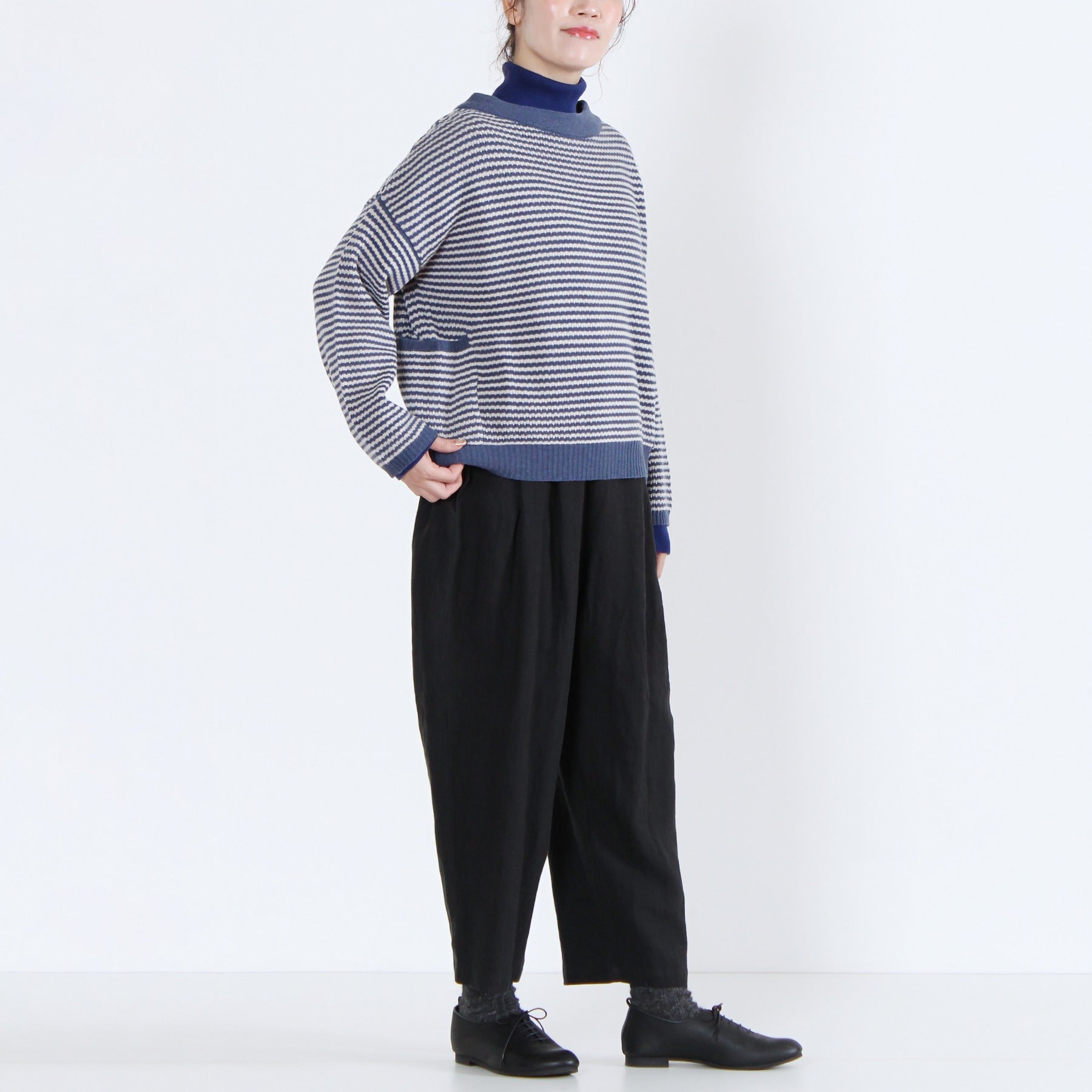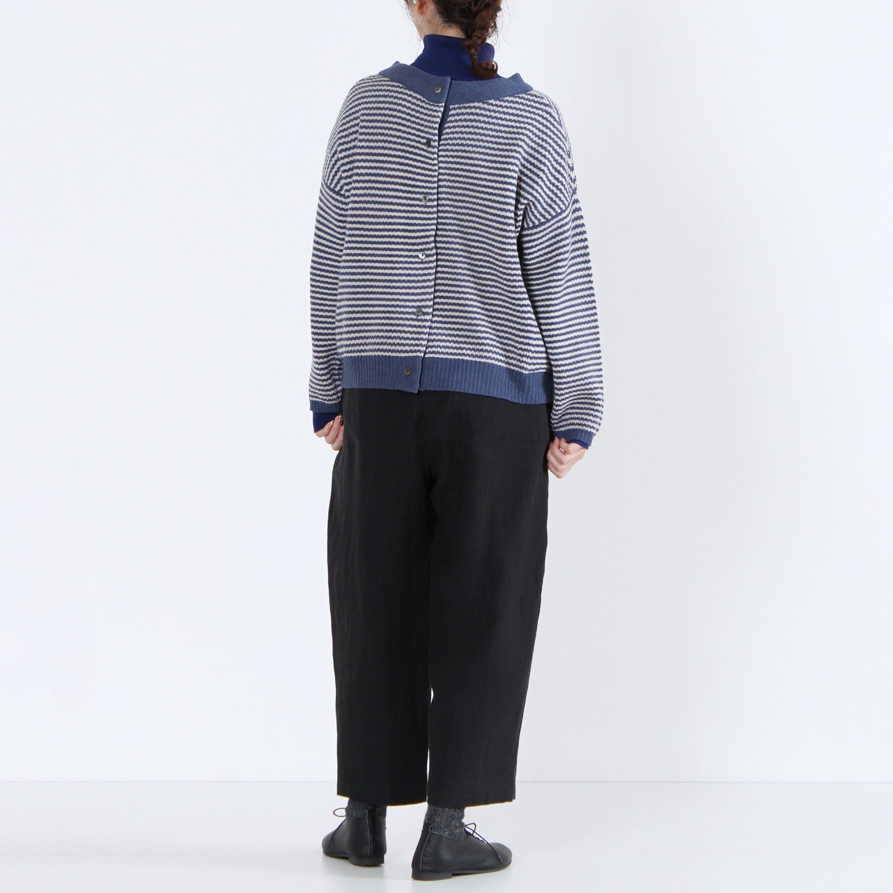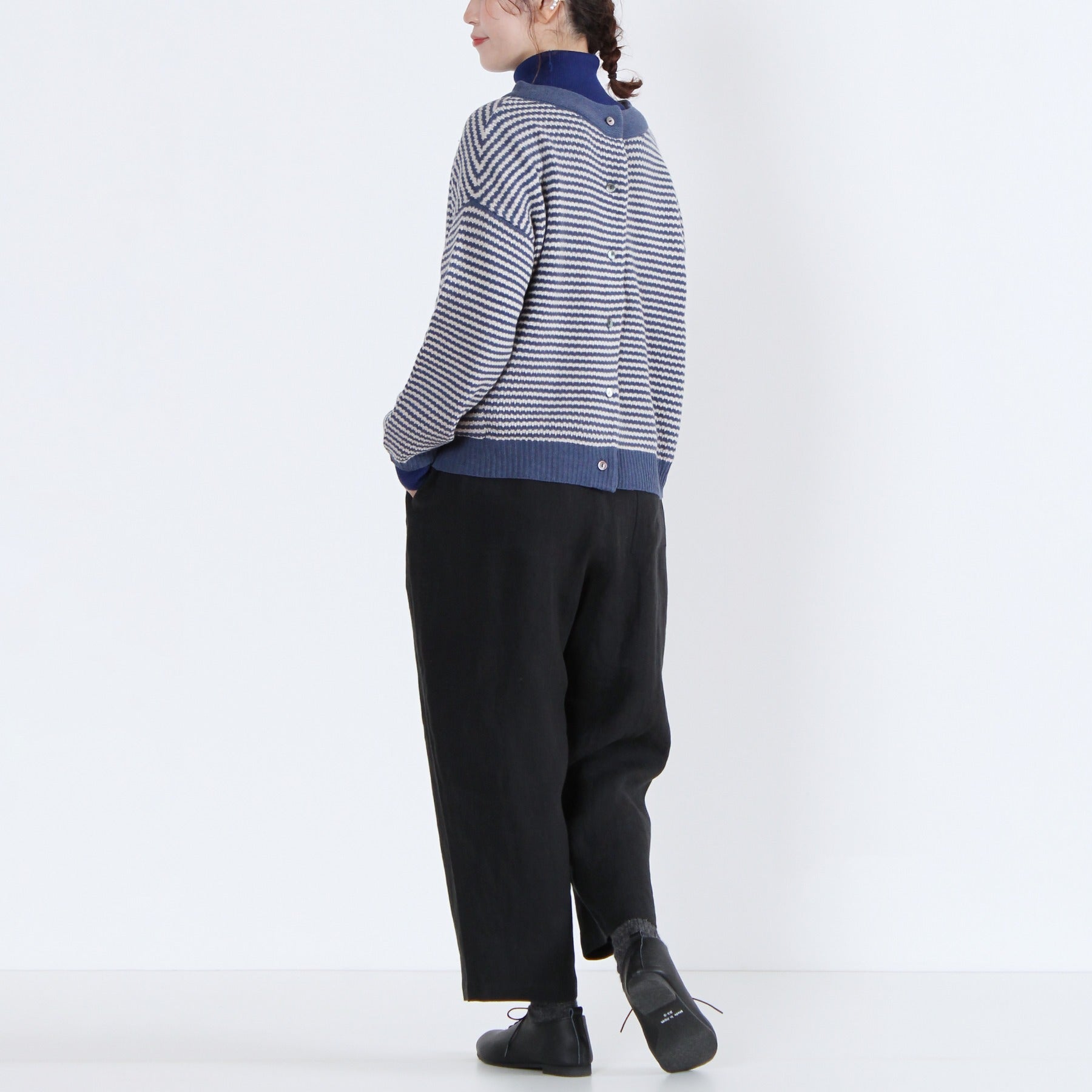 上質なイタリー糸で編み上げた、2WAY仕様のニットカーディガン。柔らかくしなやかな素材感で、季節の変わり目にも軽く羽織るだけで品のある印象を演出します。前後どちらでも着られるデザインと左右のパッチポケットが機能性とデザイン性を兼備。無地カラーと細ボーダーの多彩なカラーバリエーションで、ベーシックからアクセントまで幅広く選べる定番アイテムです。
