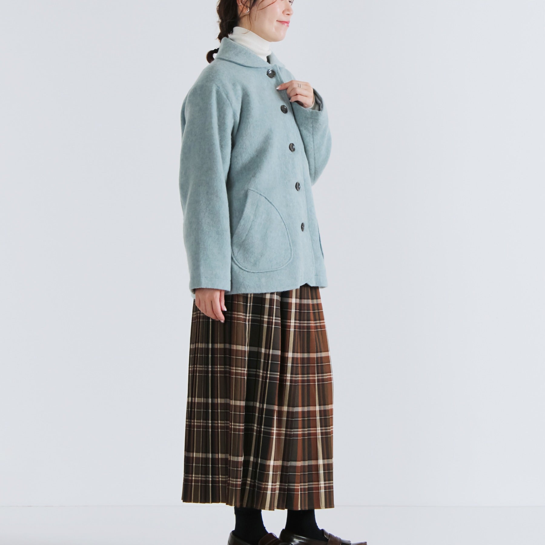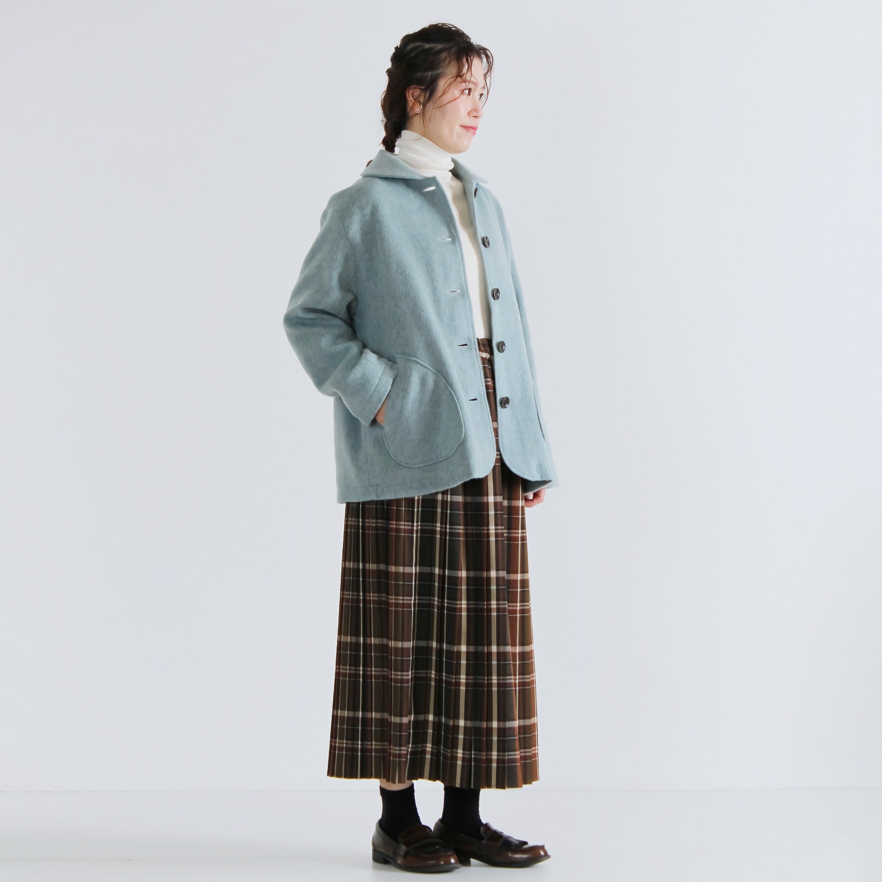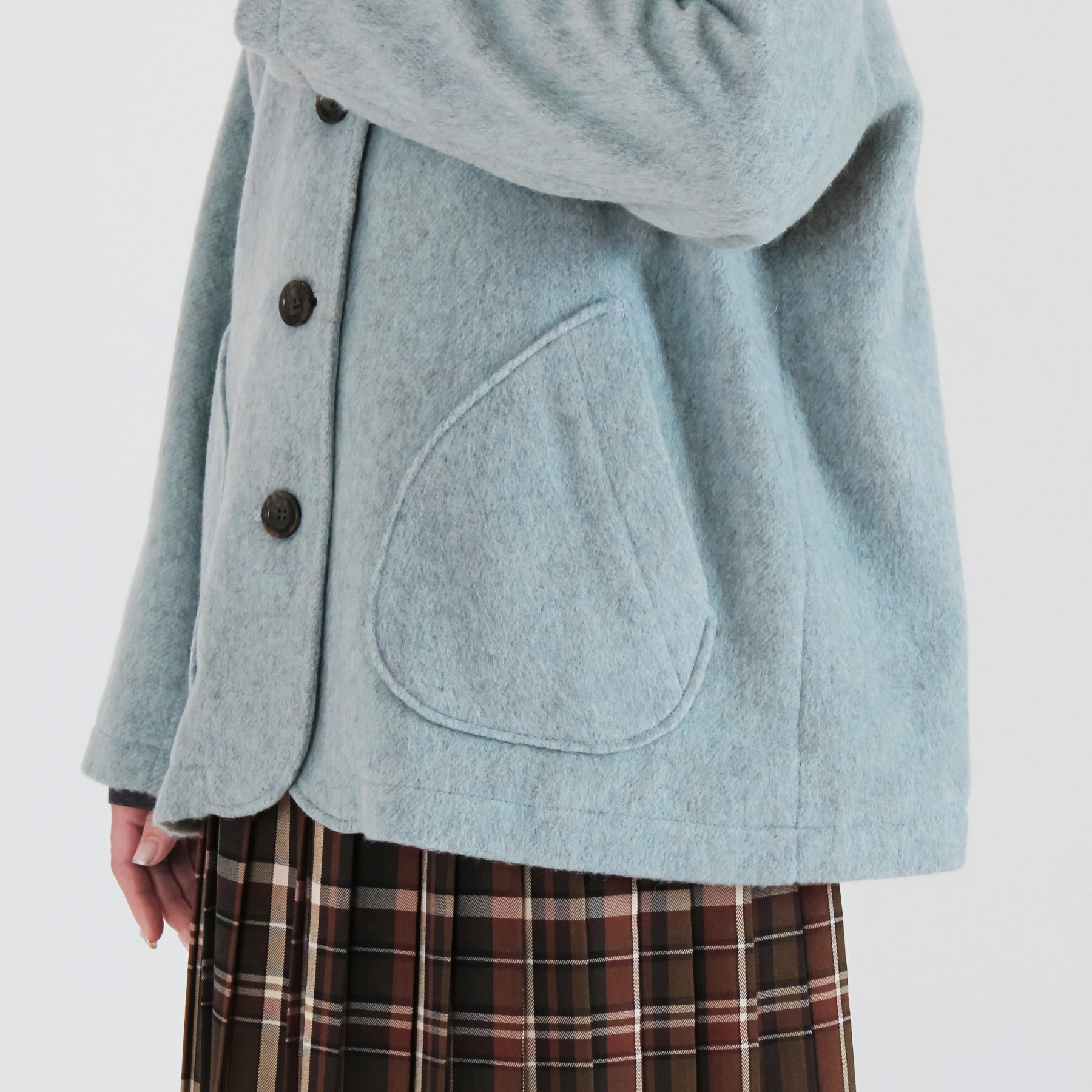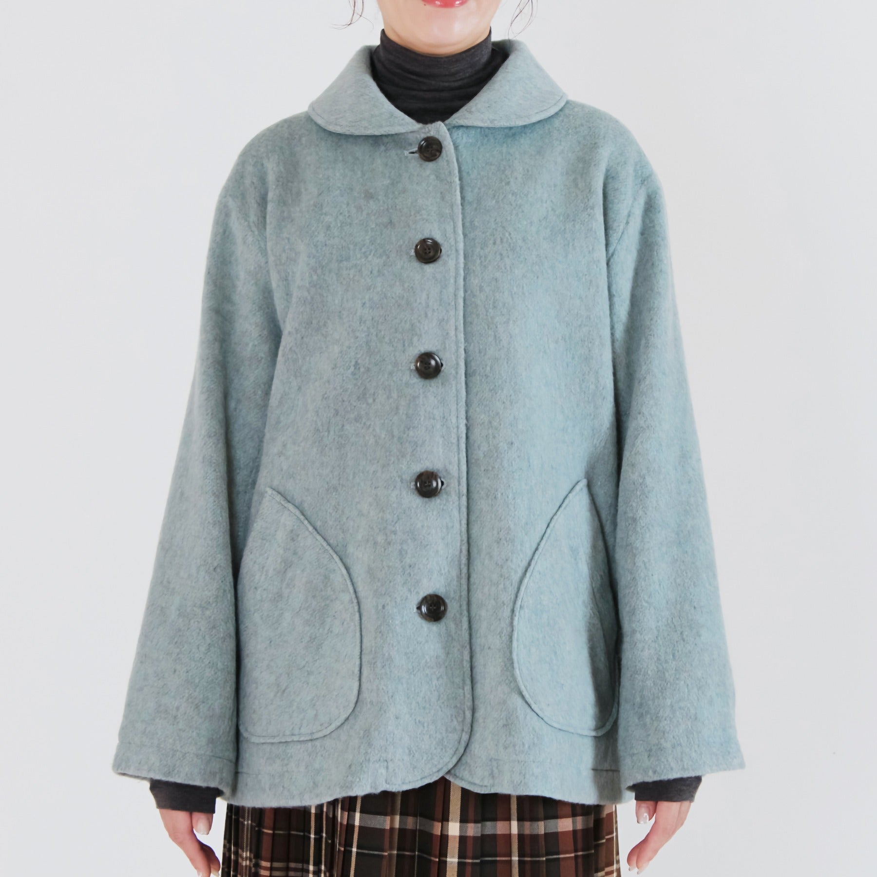 サイクルウールを使用した柔らかなウール混ビーバー素材のショールカラージャケット。丸みのあるショールカラーは高さがあり、首元までしっかり包み込んで冷たい風を防いでくれます。軽やかな生地感ながら身頃とアームホールにゆとりを持たせており、重ね着しても動きやすく快適な着心地に。両脇には手を入れやすいパッチポケットを配置し、腰回りをさりげなくカバー。滑りの良い裏地付きで、冬のデイリーアウターとして長く活躍する一着です。