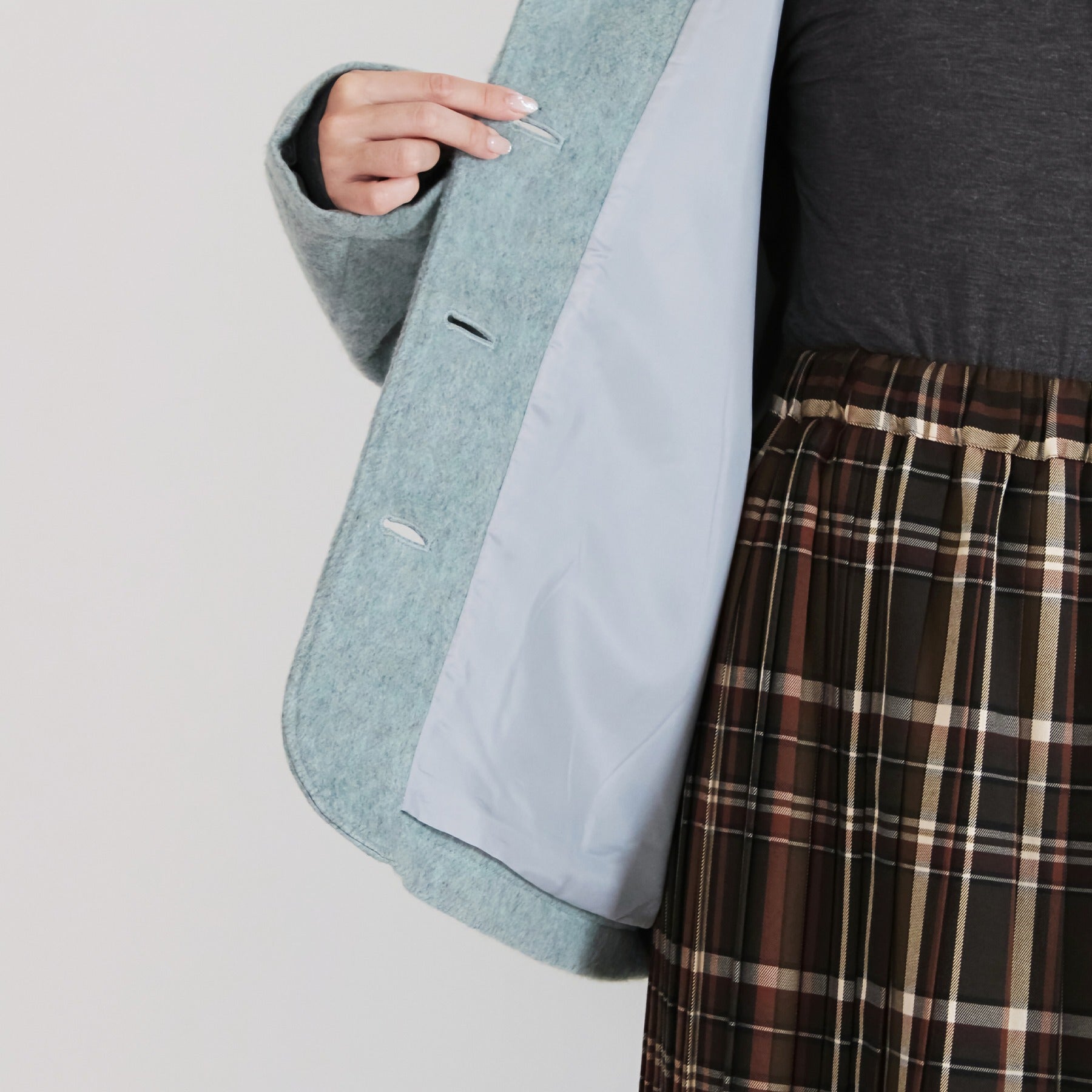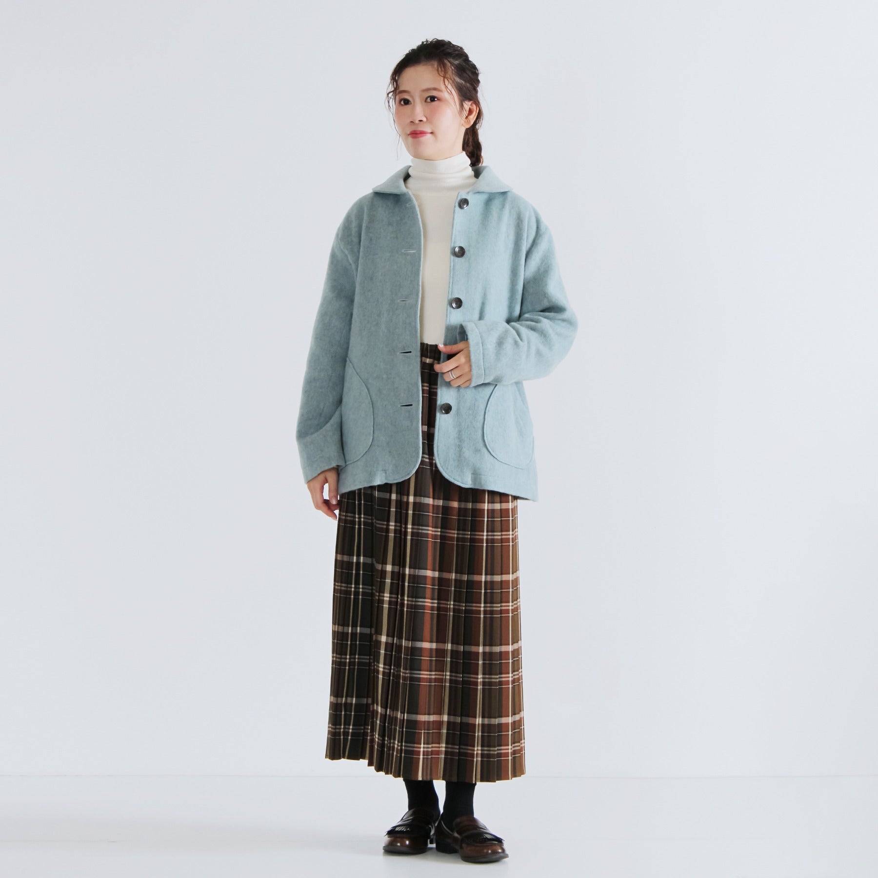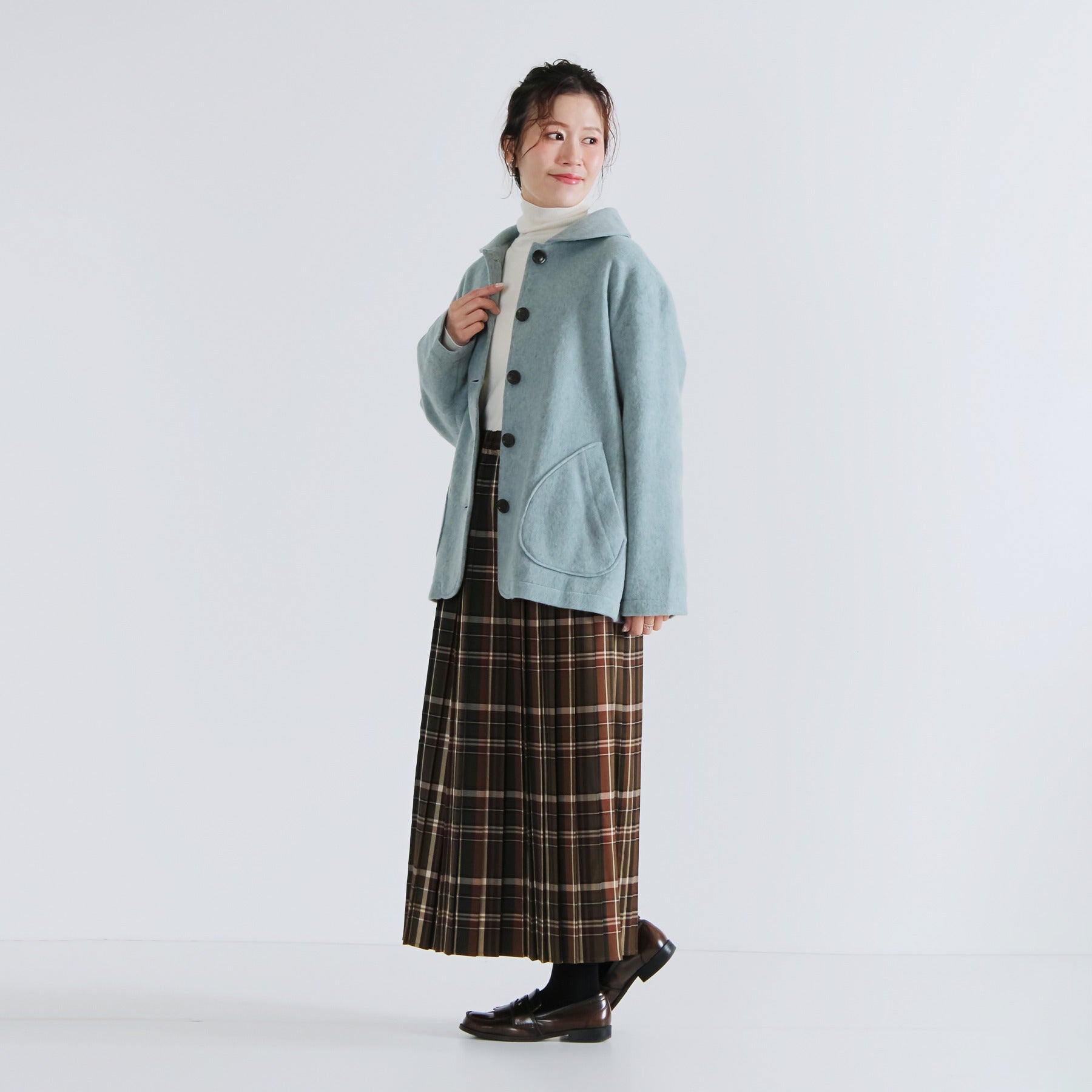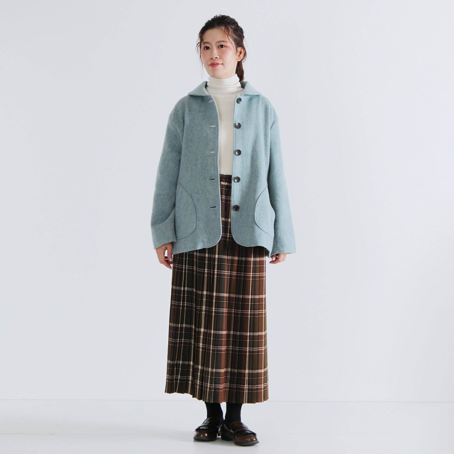 サイクルウールを使用した柔らかなウール混ビーバー素材のショールカラージャケット。丸みのあるショールカラーは高さがあり、首元までしっかり包み込んで冷たい風を防いでくれます。軽やかな生地感ながら身頃とアームホールにゆとりを持たせており、重ね着しても動きやすく快適な着心地に。両脇には手を入れやすいパッチポケットを配置し、腰回りをさりげなくカバー。滑りの良い裏地付きで、冬のデイリーアウターとして長く活躍する一着です。