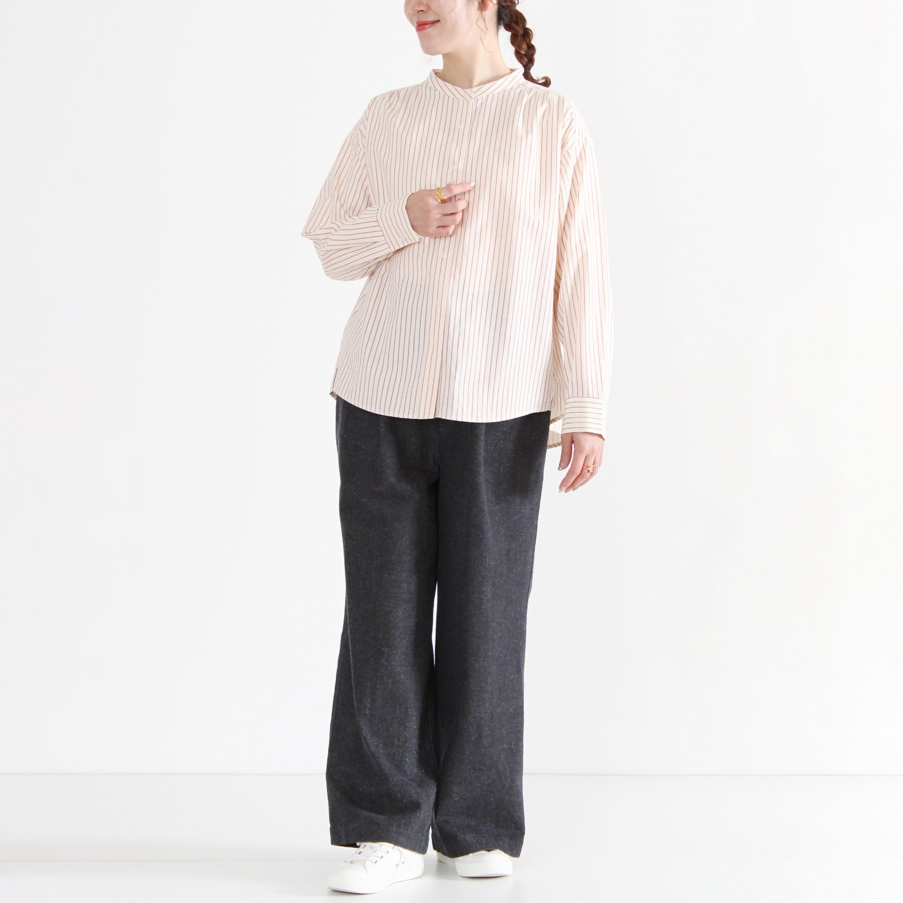 コットンリネンデニムを使用したストレートタックパンツ。