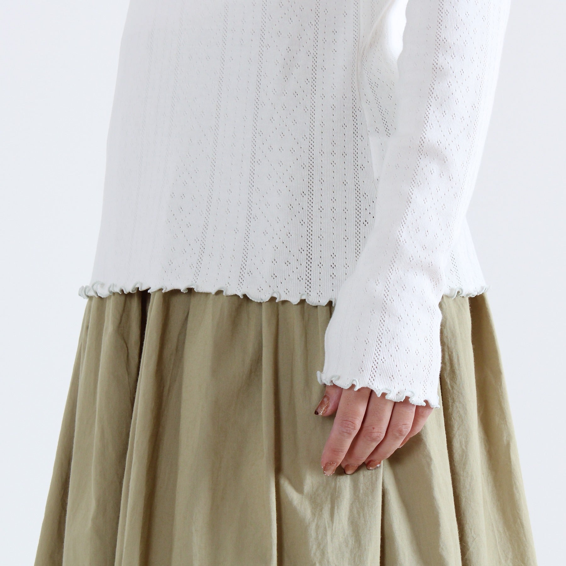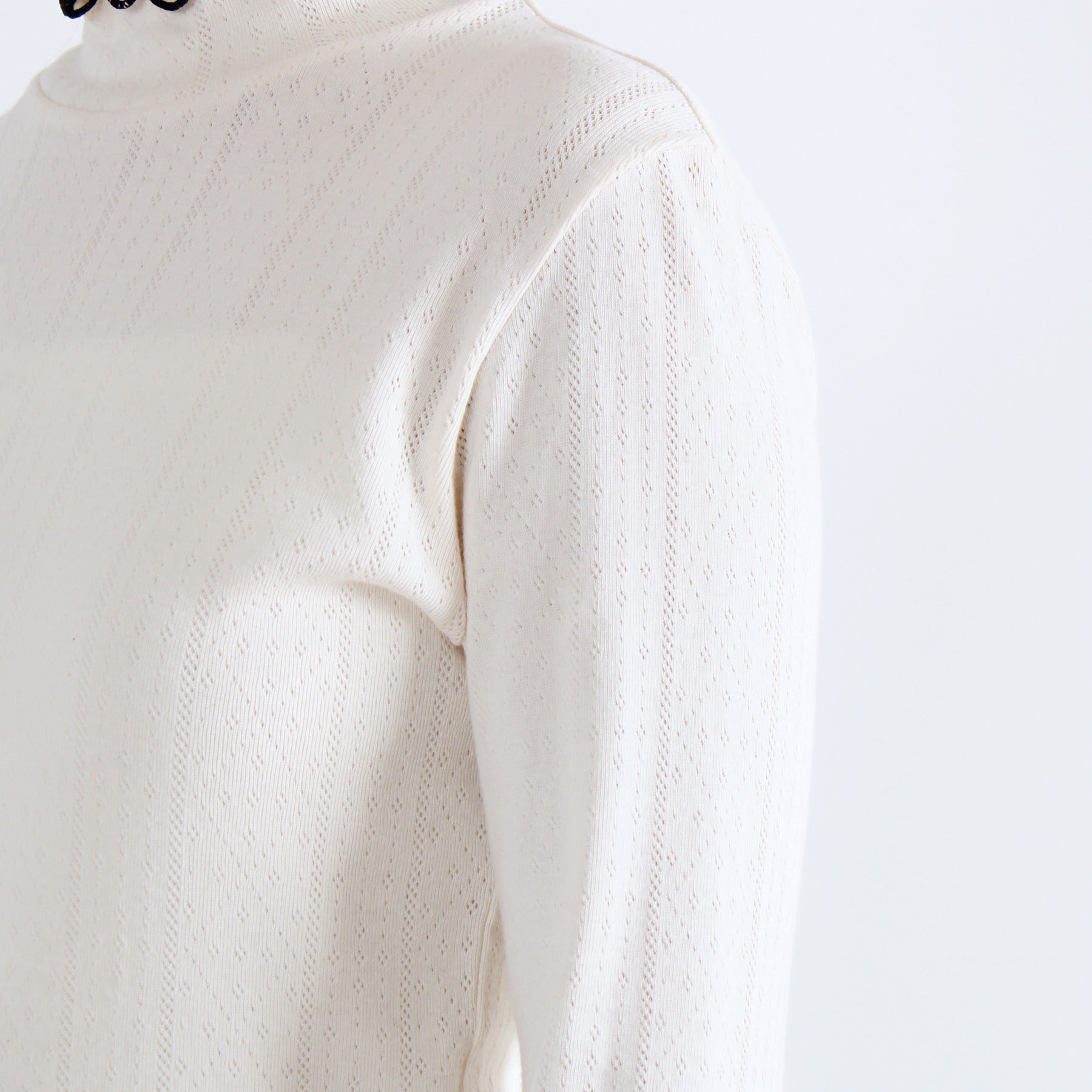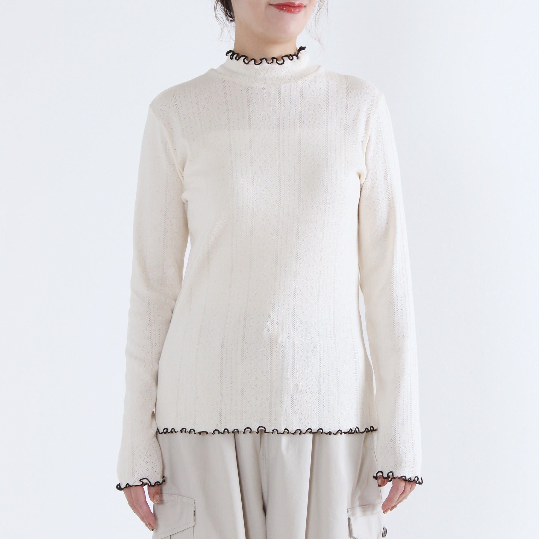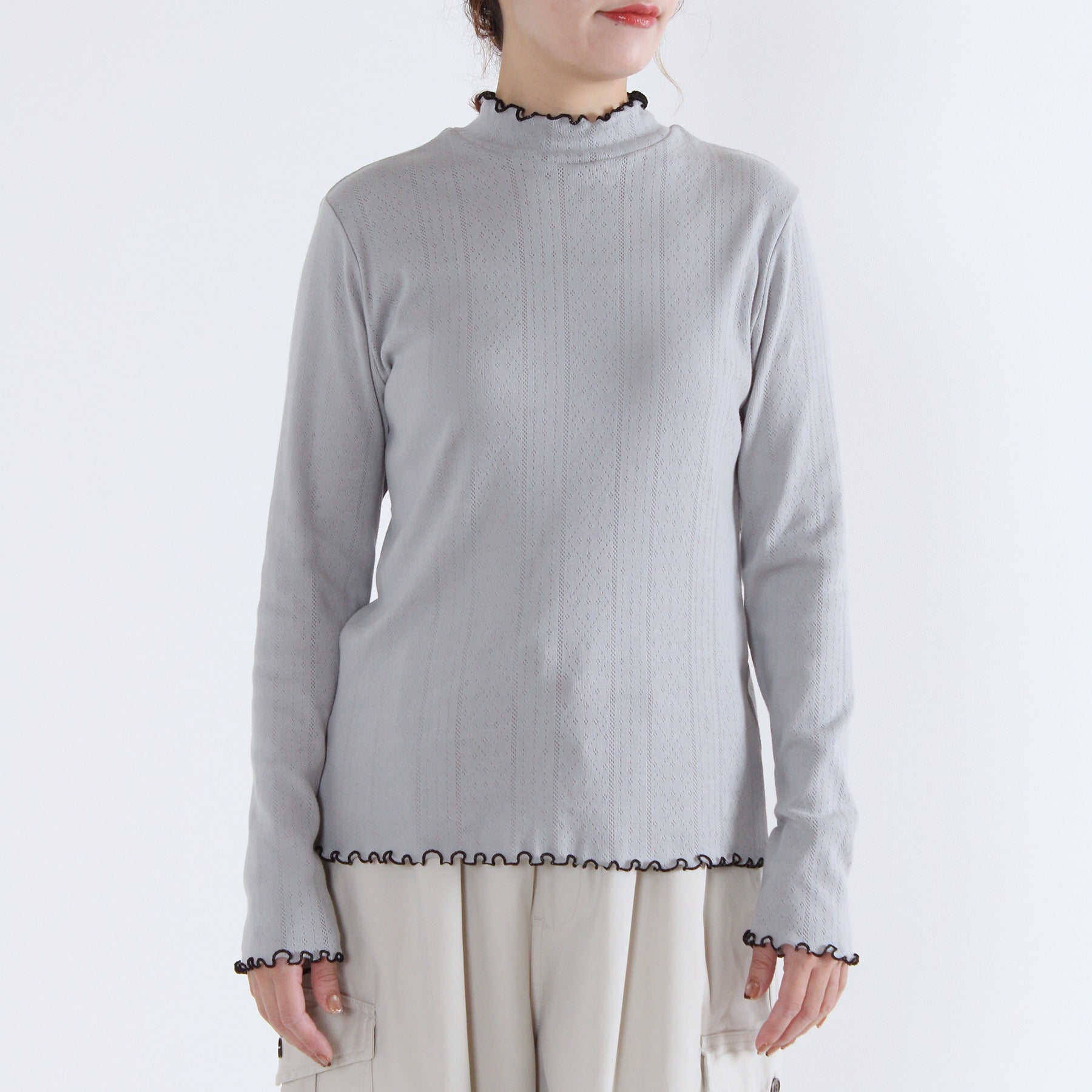 伸びの良いフライス素材に小花柄を散りばめた、バイカラーパターンメッシュのハイネックプルオーバー。柔らかく肌ざわりの良い生地を使用し、1枚でもインナーとしても快適に着られる万能トップスです。袖口や裾、襟元に施したメローフリルがさり気ないアクセントに。少し長めの袖丈が手元を華奢に見せ、レイヤードスタイルにもぴったり。上品なバイカラー配色が大人の可愛らしさを引き立てます。国内のファクトリーで丁寧に編み上げた日本製アイテムです。