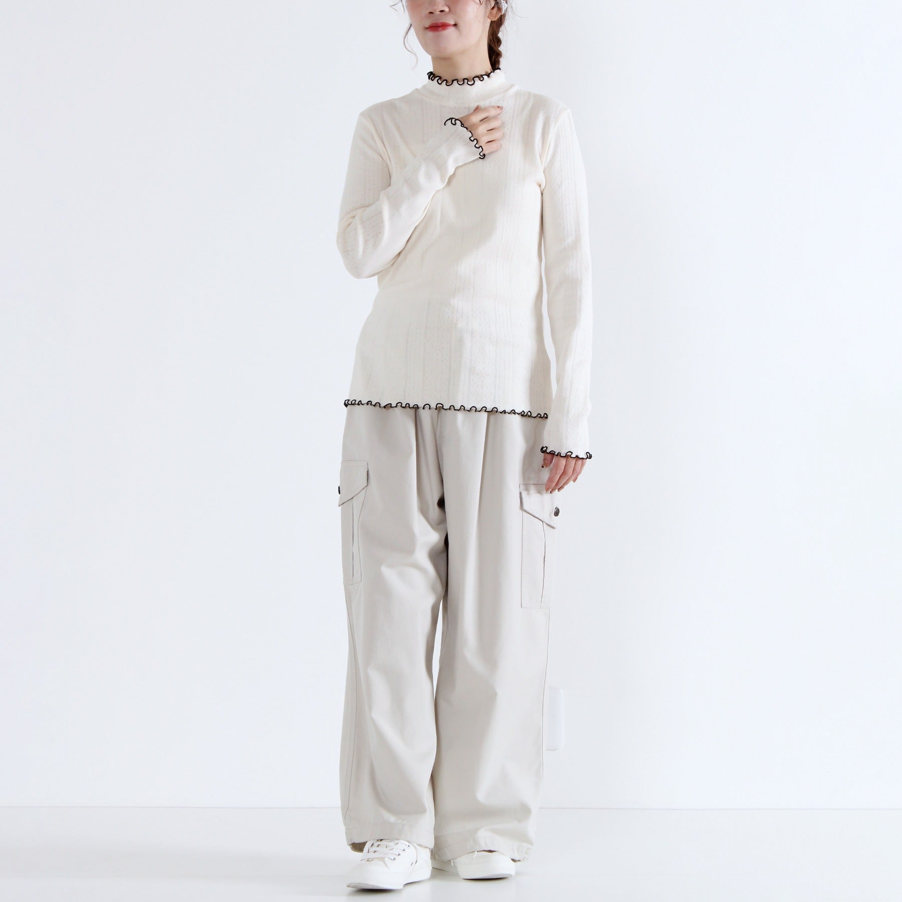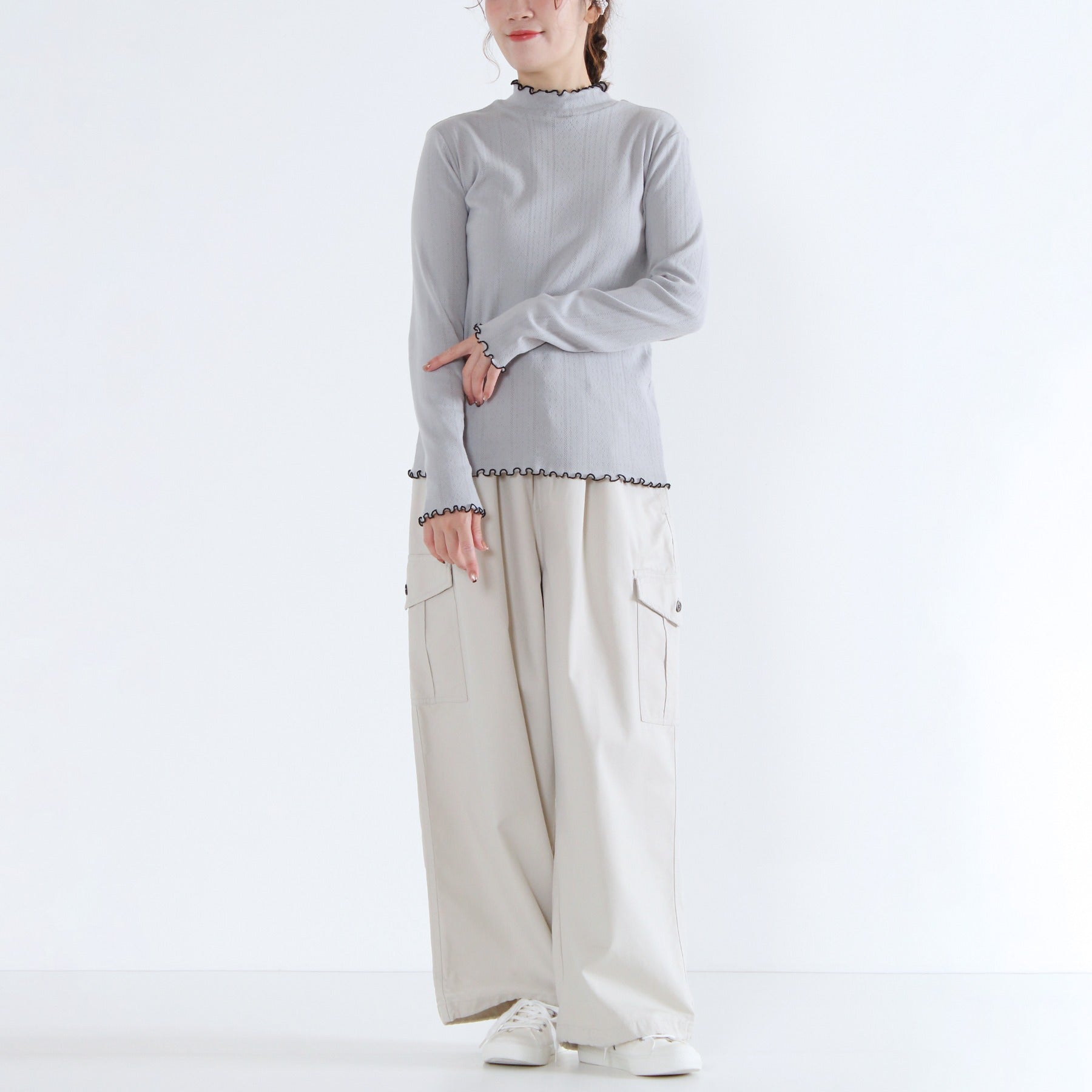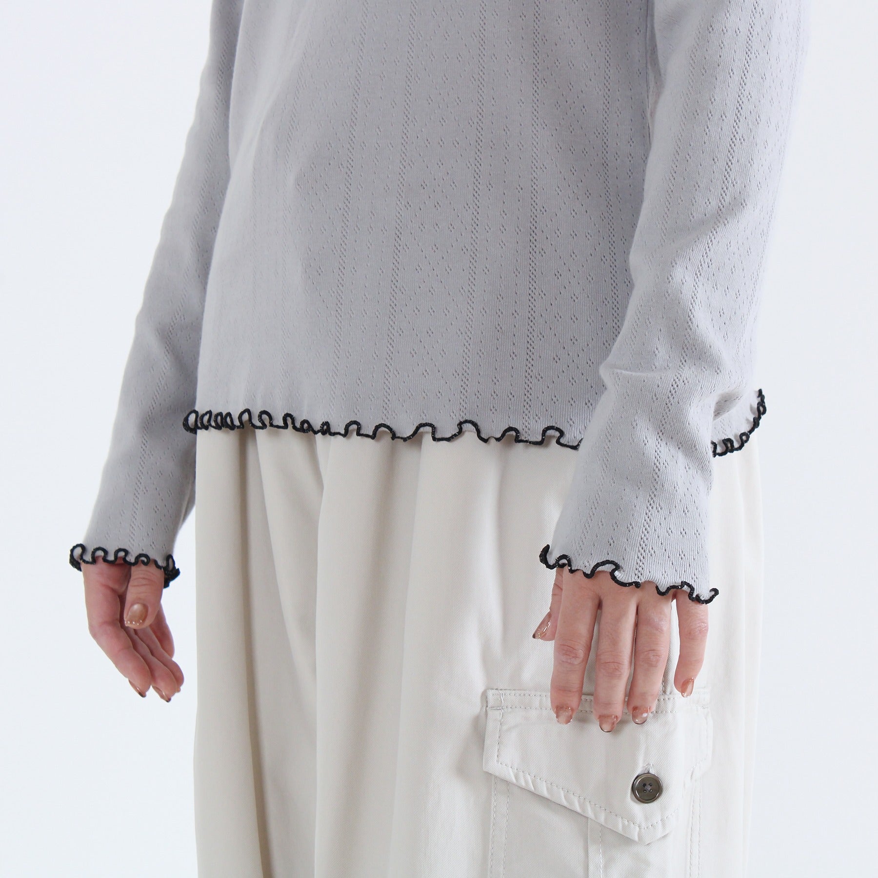 伸びの良いフライス素材に小花柄を散りばめた、バイカラーパターンメッシュのハイネックプルオーバー。柔らかく肌ざわりの良い生地を使用し、1枚でもインナーとしても快適に着られる万能トップスです。袖口や裾、襟元に施したメローフリルがさり気ないアクセントに。少し長めの袖丈が手元を華奢に見せ、レイヤードスタイルにもぴったり。上品なバイカラー配色が大人の可愛らしさを引き立てます。国内のファクトリーで丁寧に編み上げた日本製アイテムです。
