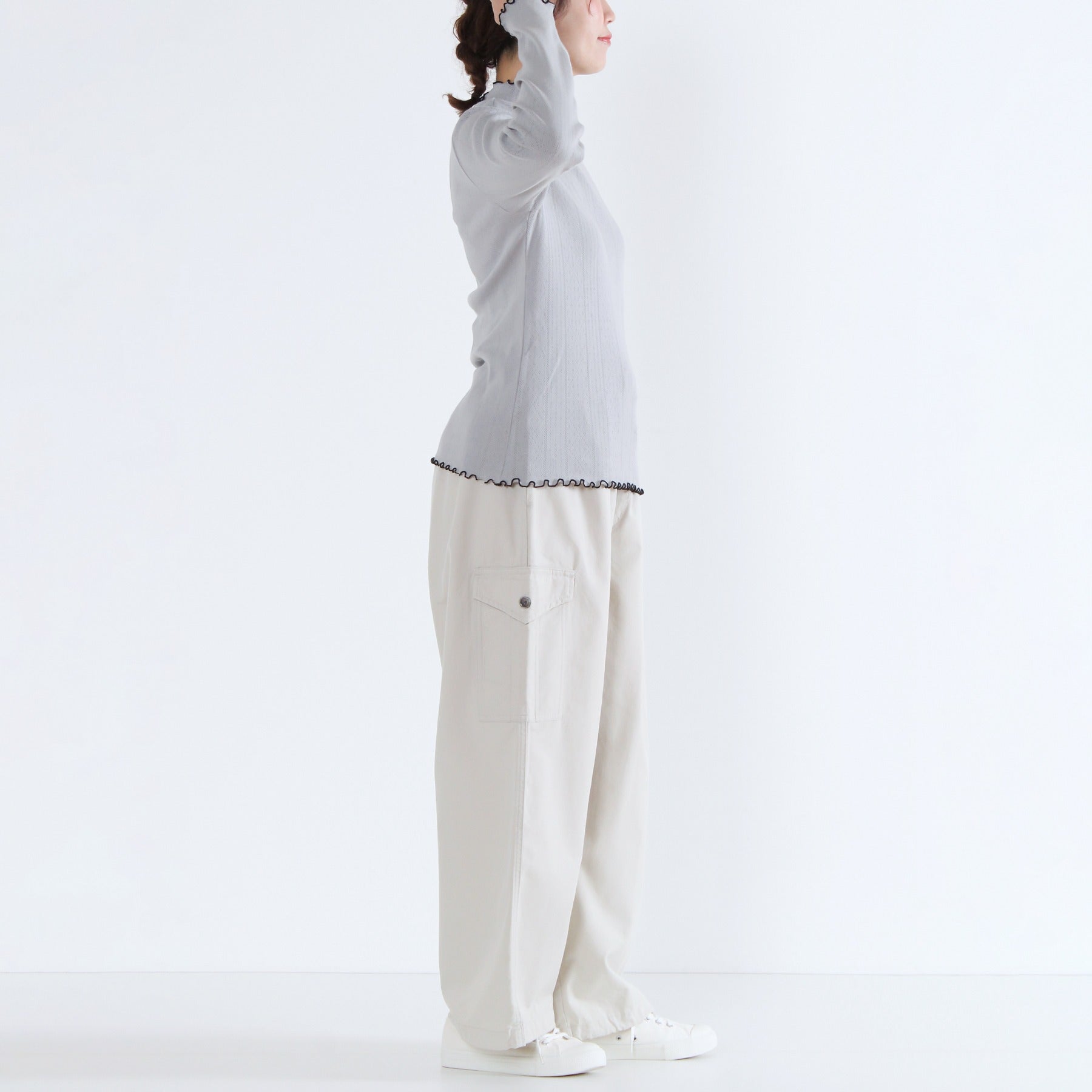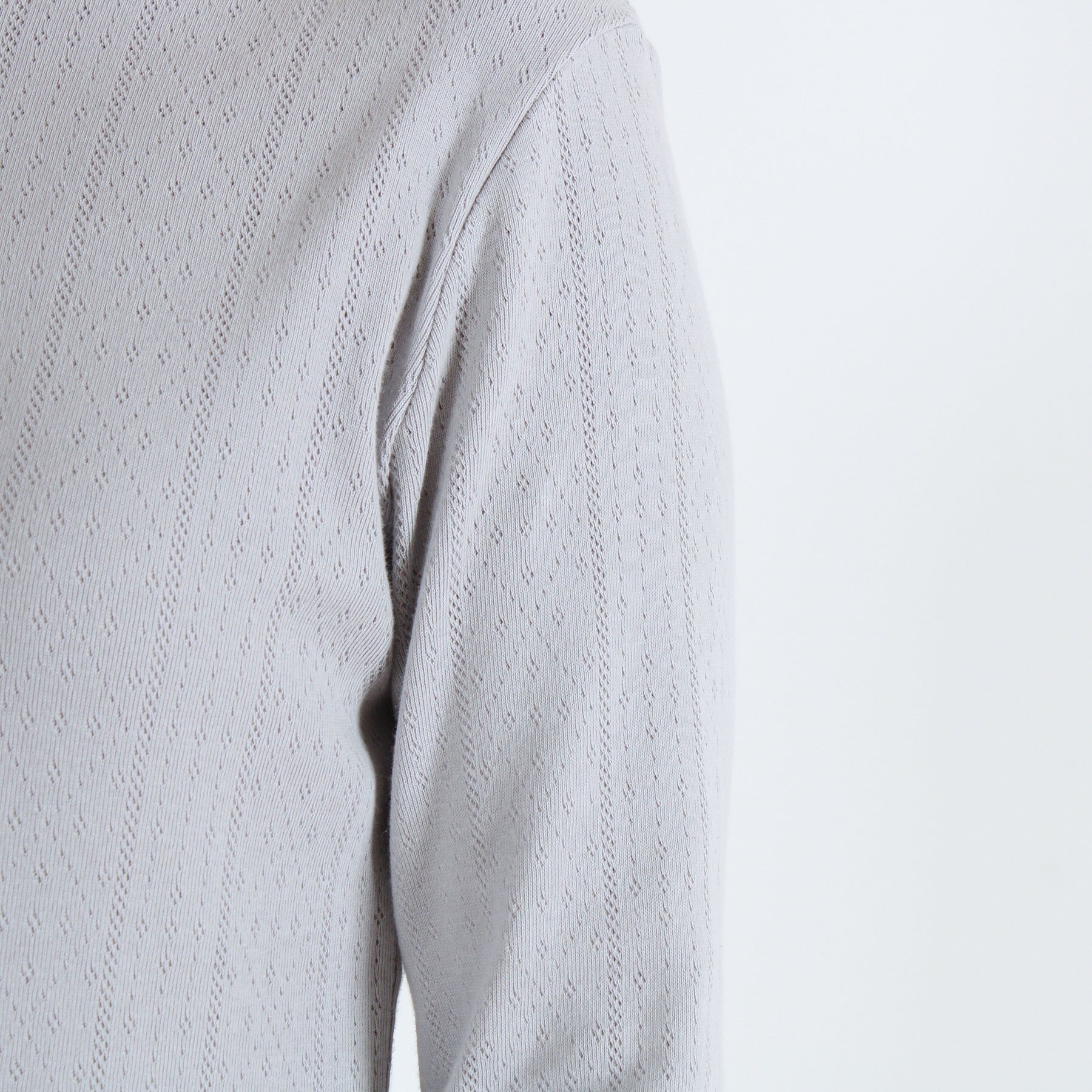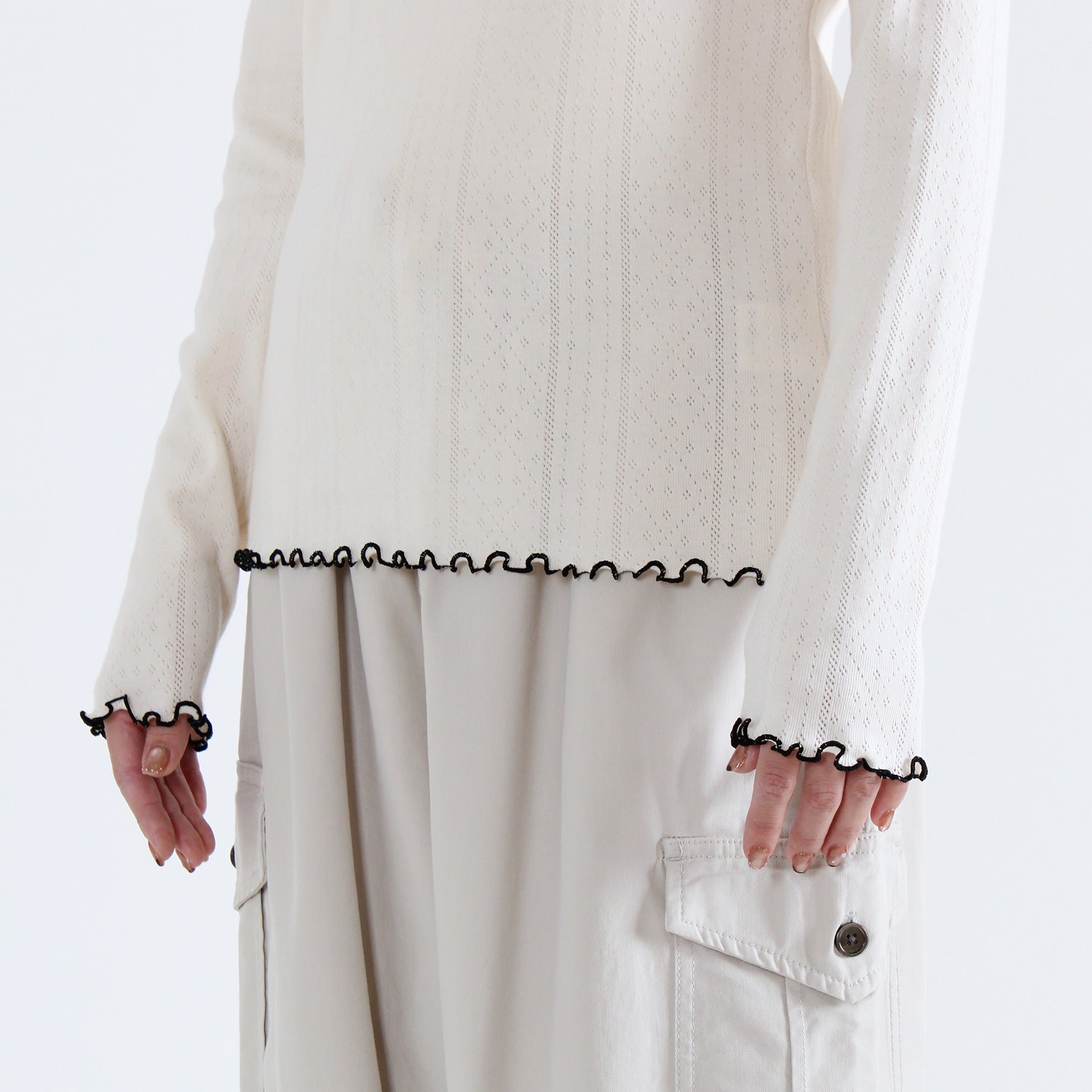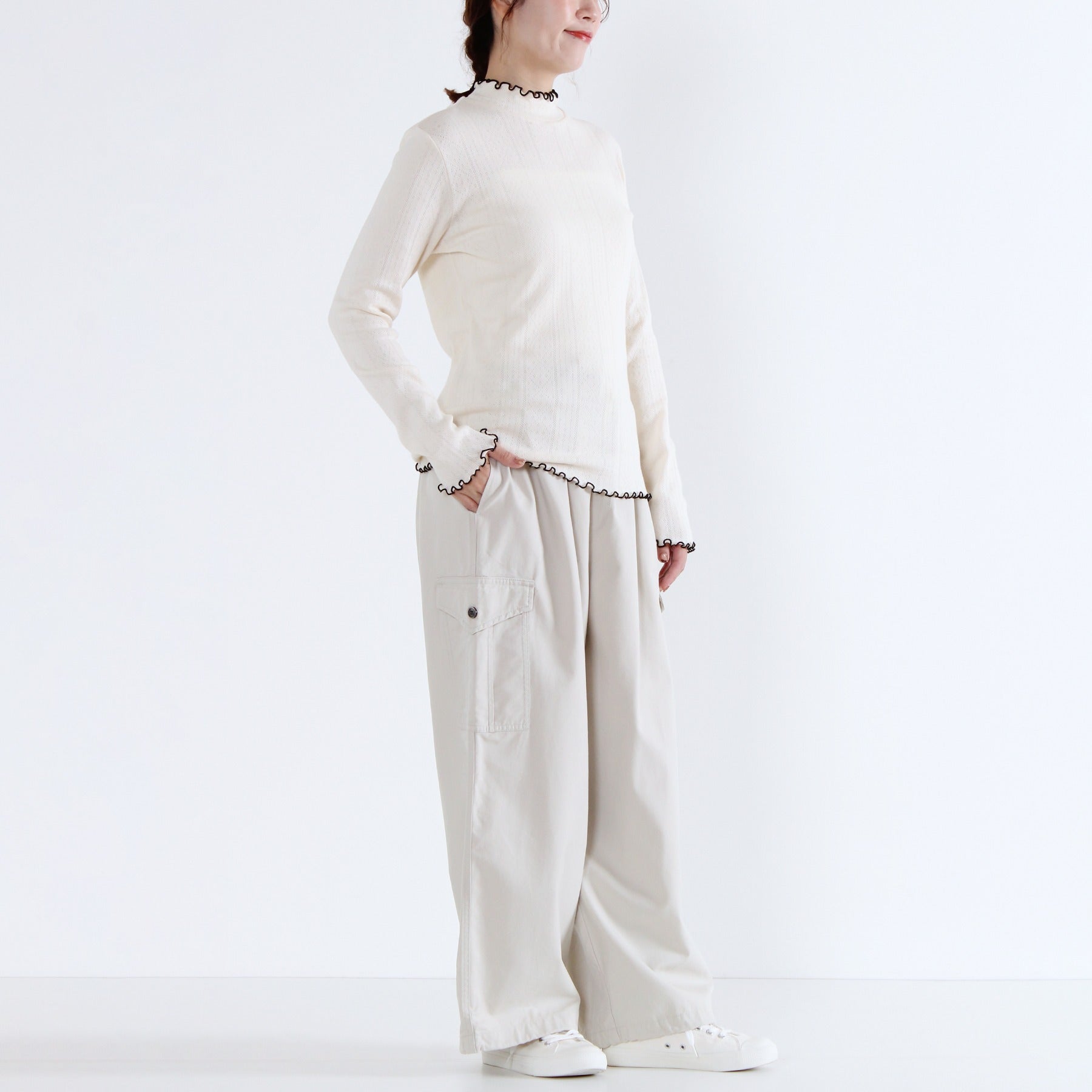 伸びの良いフライス素材に小花柄を散りばめた、バイカラーパターンメッシュのハイネックプルオーバー。柔らかく肌ざわりの良い生地を使用し、1枚でもインナーとしても快適に着られる万能トップスです。袖口や裾、襟元に施したメローフリルがさり気ないアクセントに。少し長めの袖丈が手元を華奢に見せ、レイヤードスタイルにもぴったり。上品なバイカラー配色が大人の可愛らしさを引き立てます。国内のファクトリーで丁寧に編み上げた日本製アイテムです。
