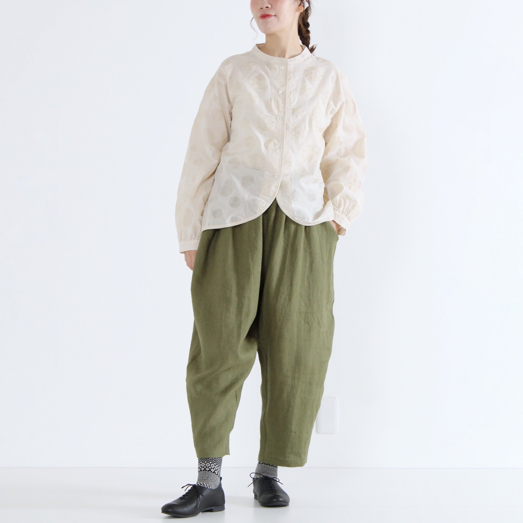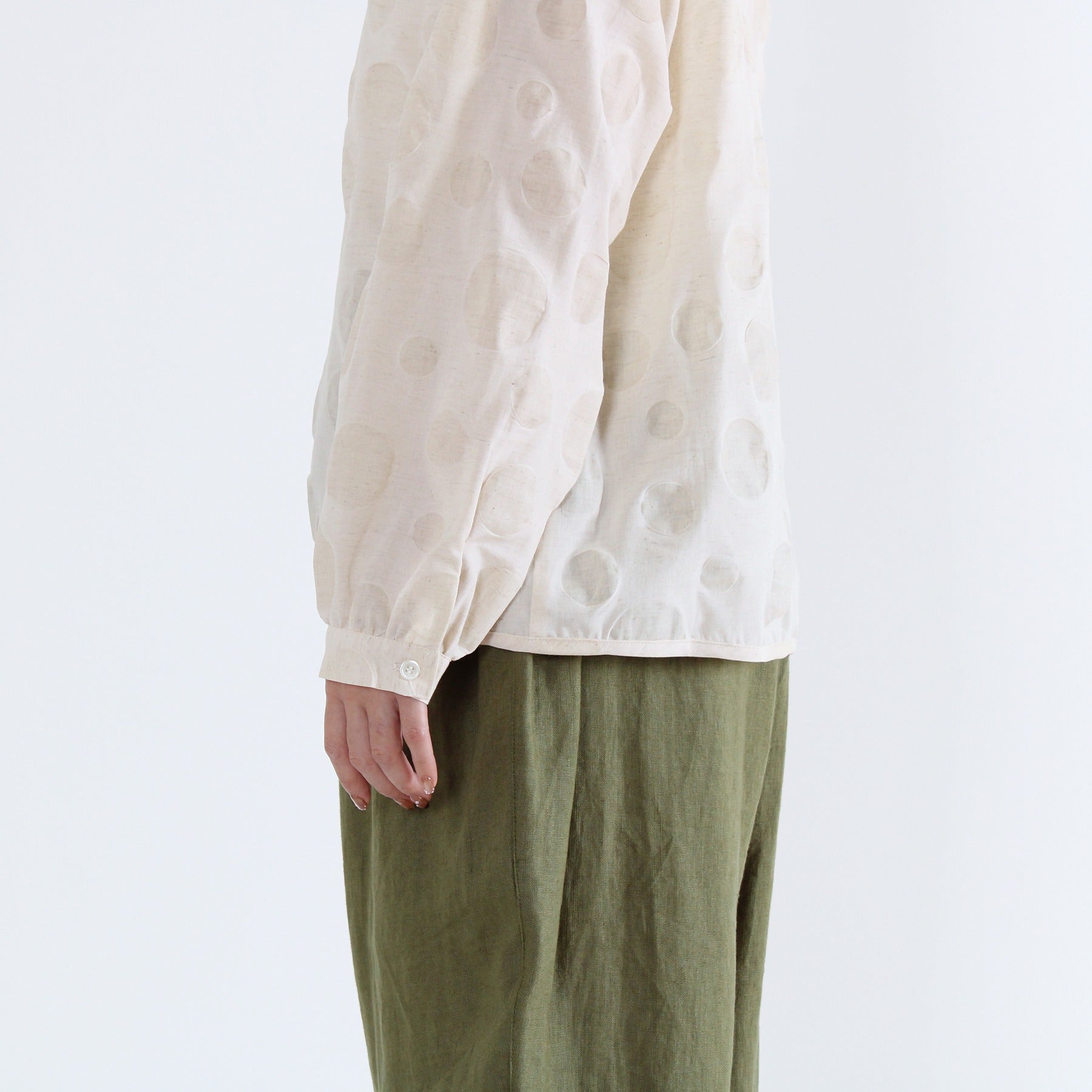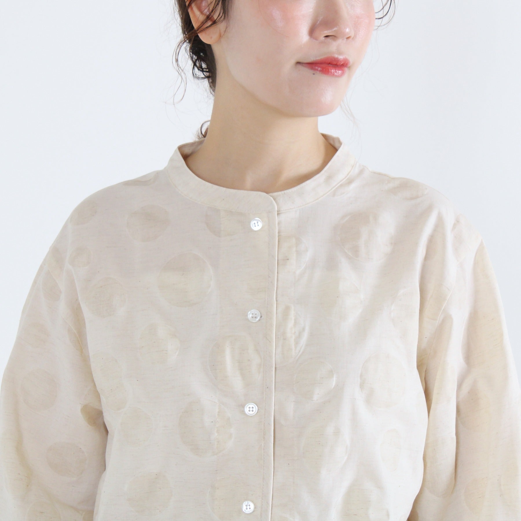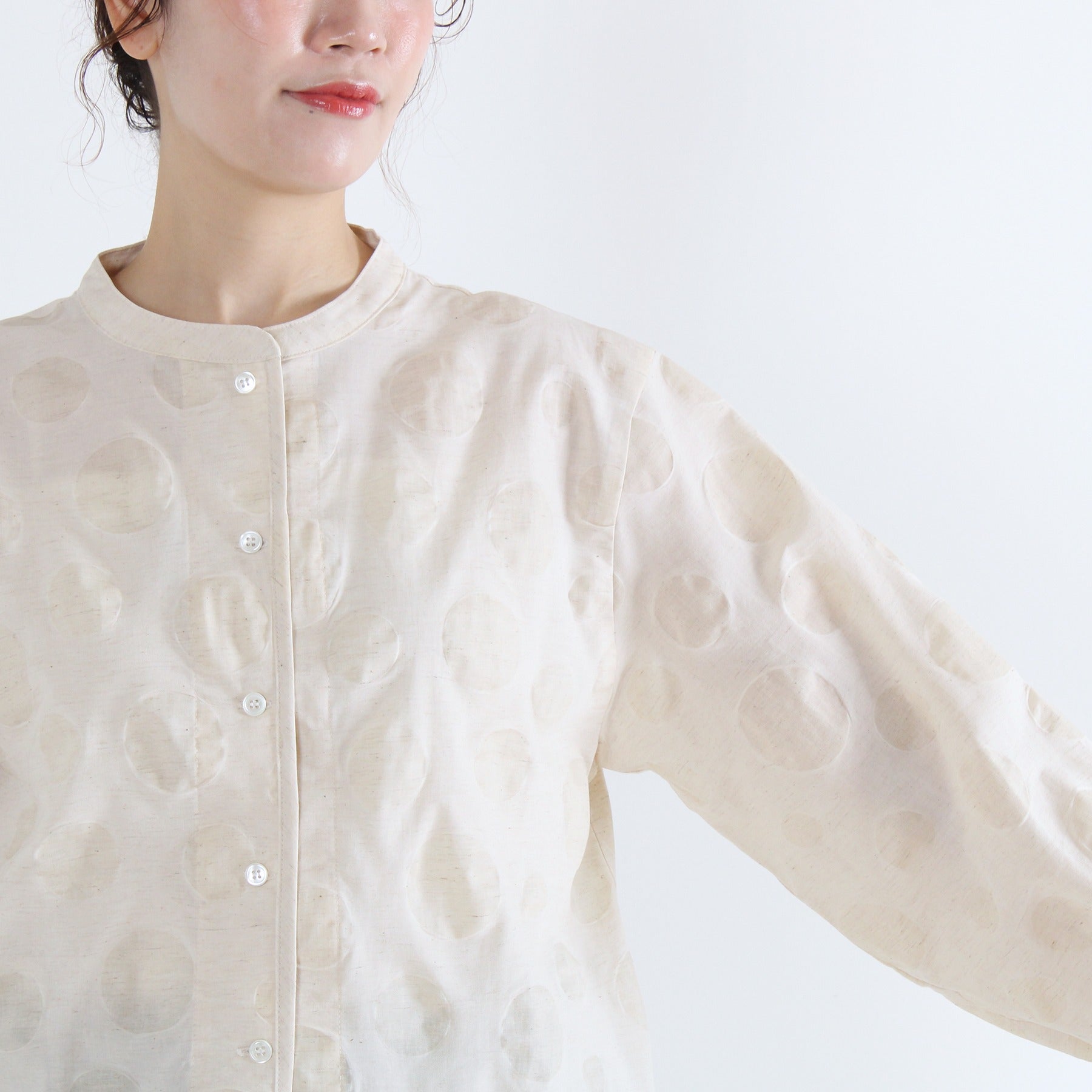 コットンリネン素材に塩縮加工を施したドット柄シャツジャケット。独特のシワ感と軽やかな風合いが魅力で、さらりと羽織れる一枚です。丸みのあるシルエットと小ぶりな襟が女性らしさを演出。前開き仕様で、インナーとのレイヤードも楽しめます。