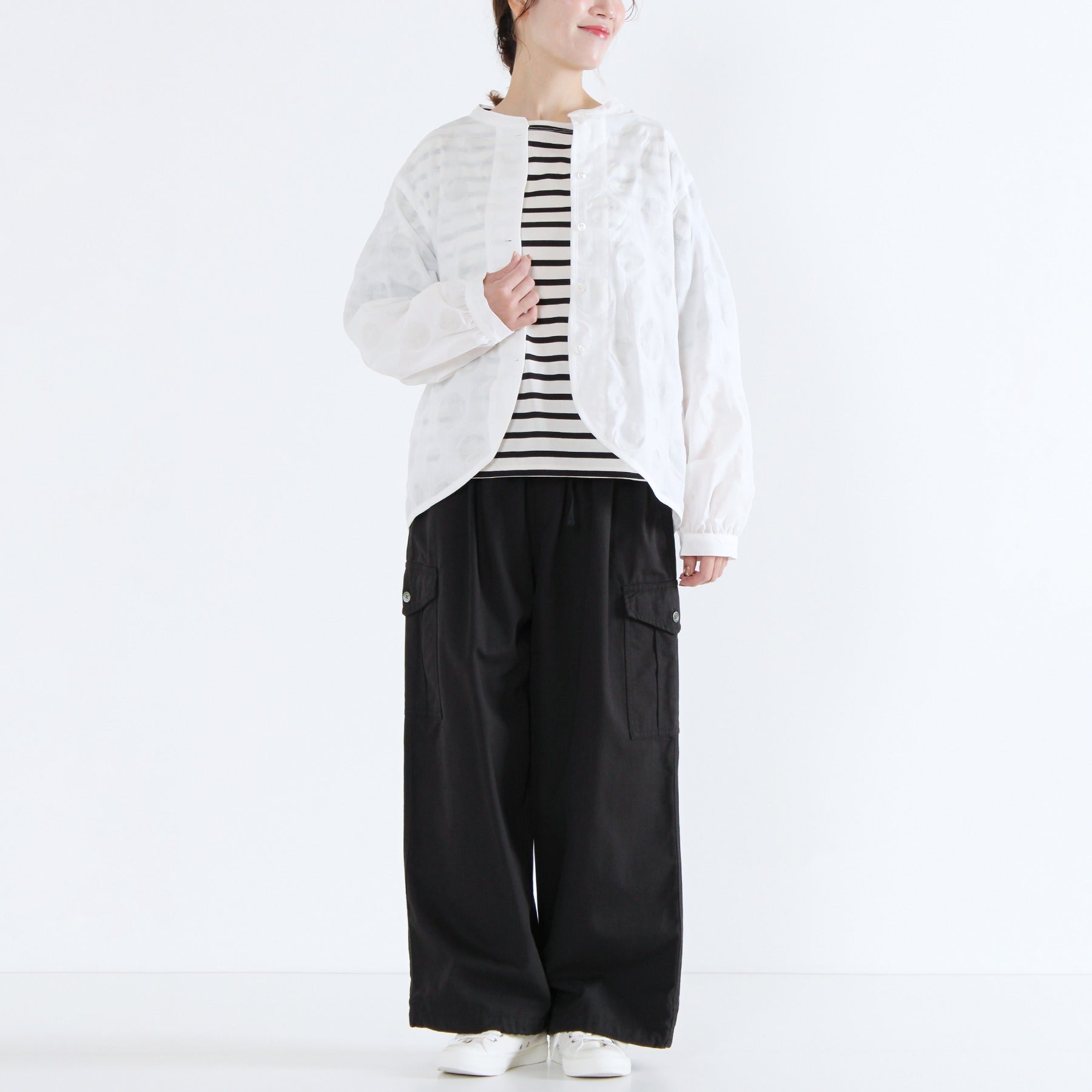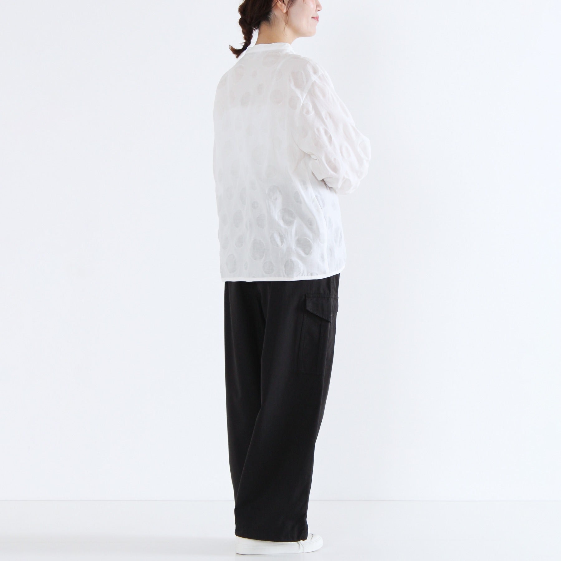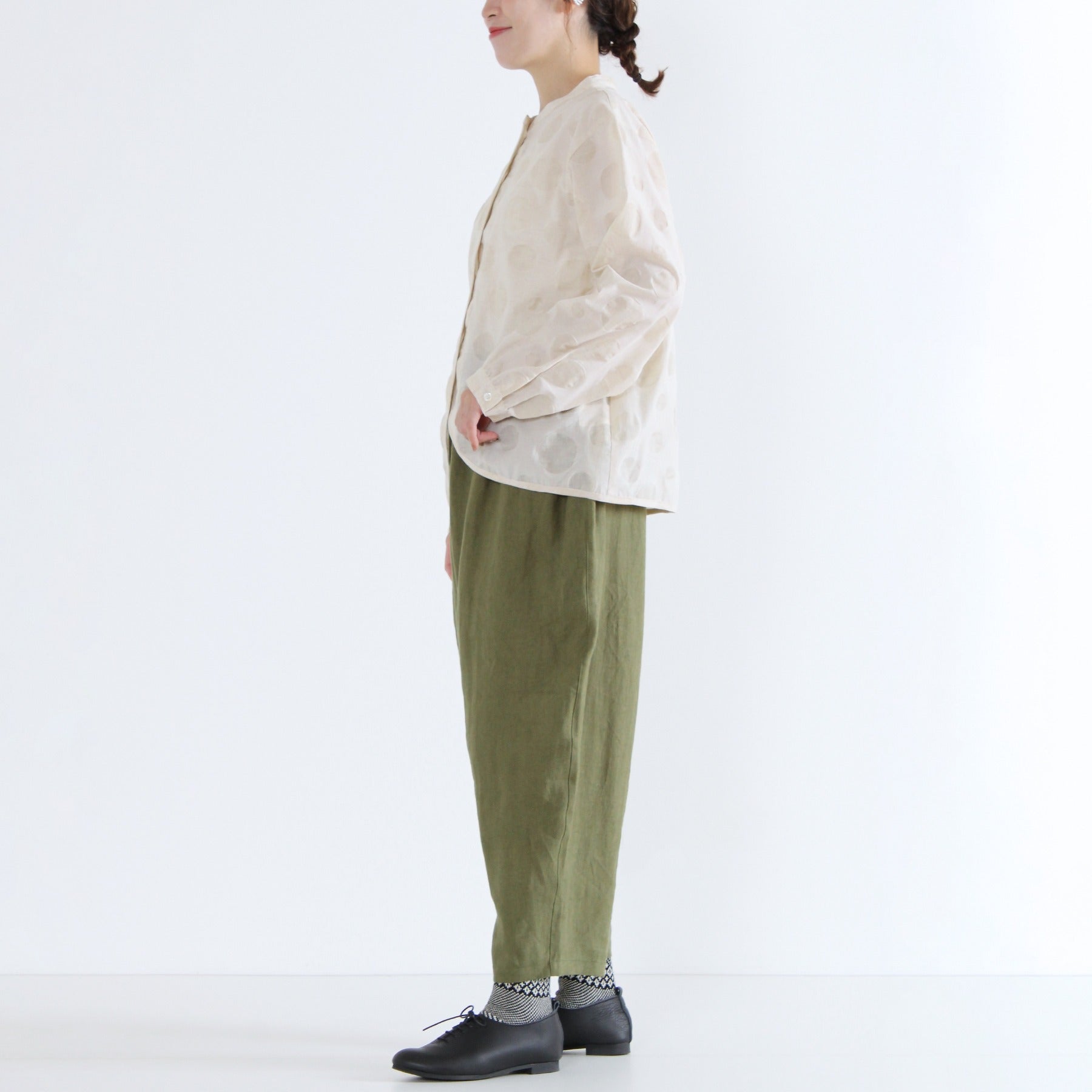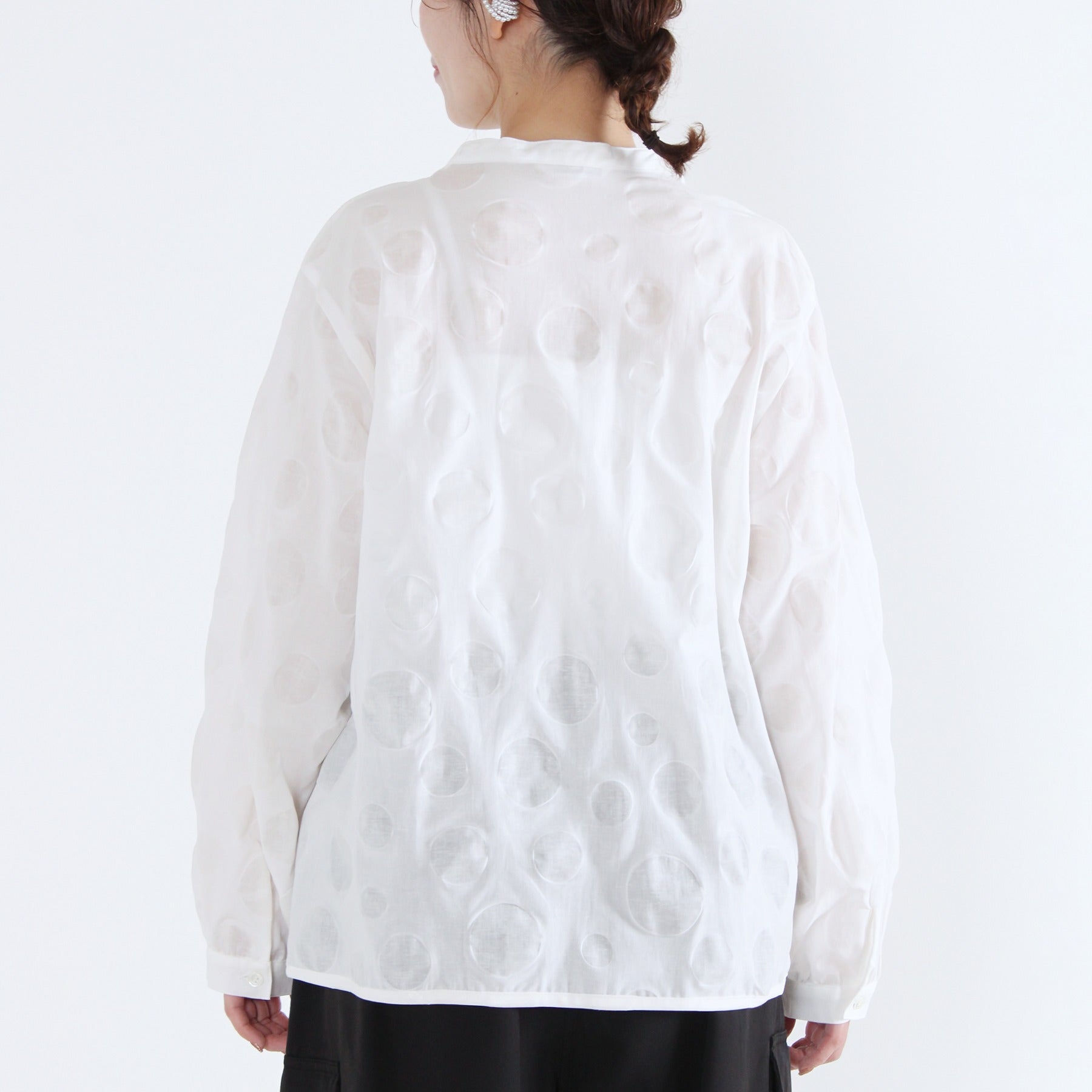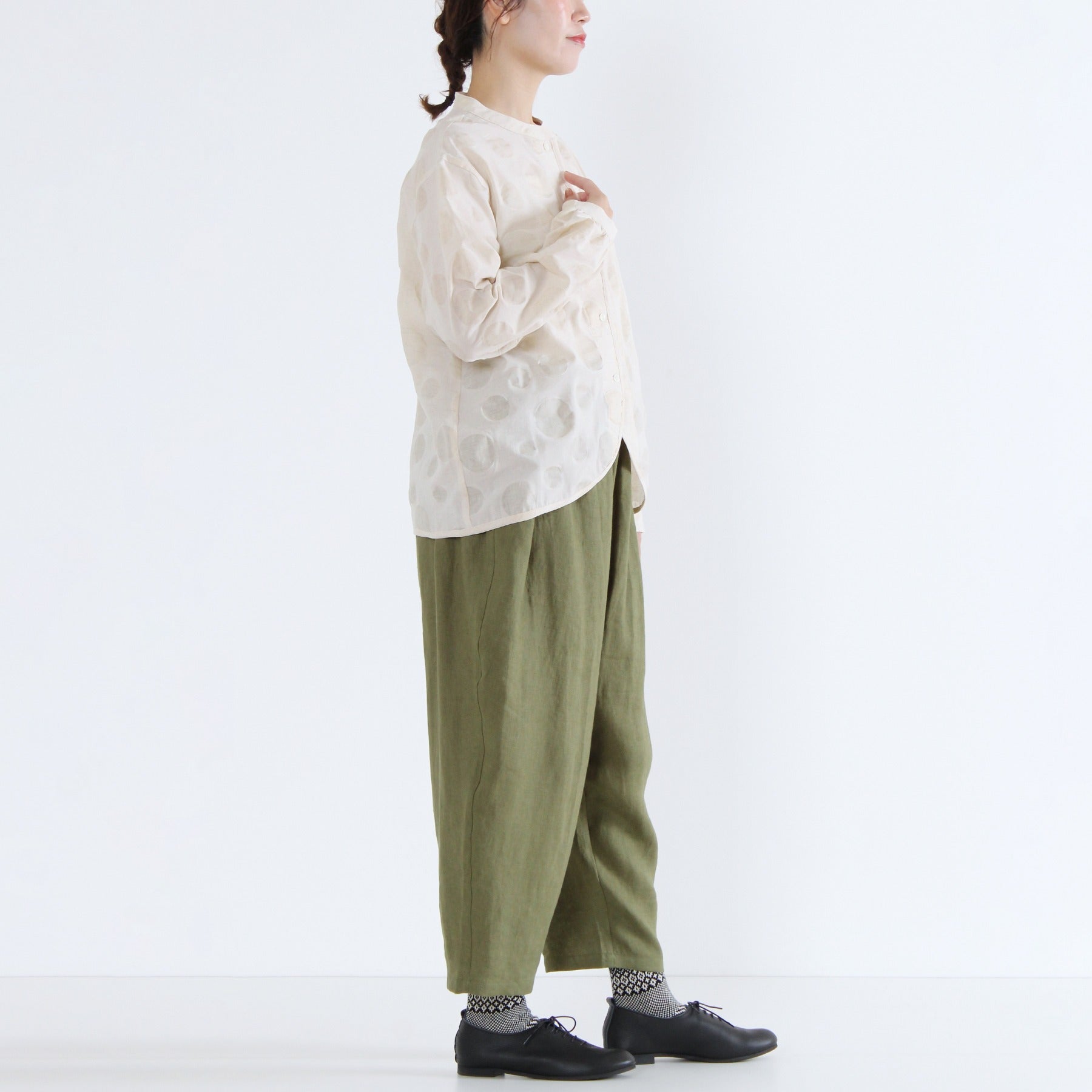 コットンリネン素材に塩縮加工を施したドット柄シャツジャケット。独特のシワ感と軽やかな風合いが魅力で、さらりと羽織れる一枚です。丸みのあるシルエットと小ぶりな襟が女性らしさを演出。前開き仕様で、インナーとのレイヤードも楽しめます。