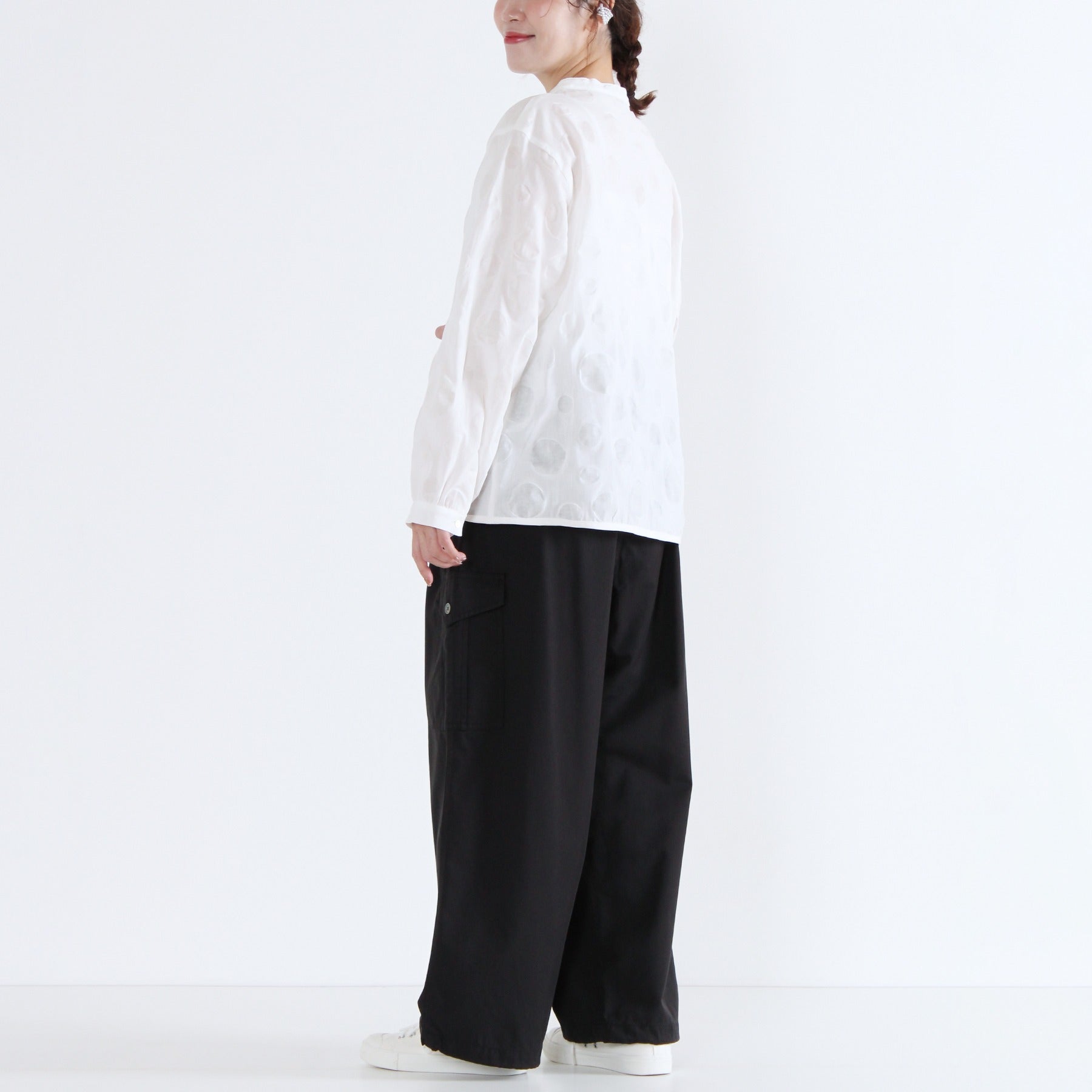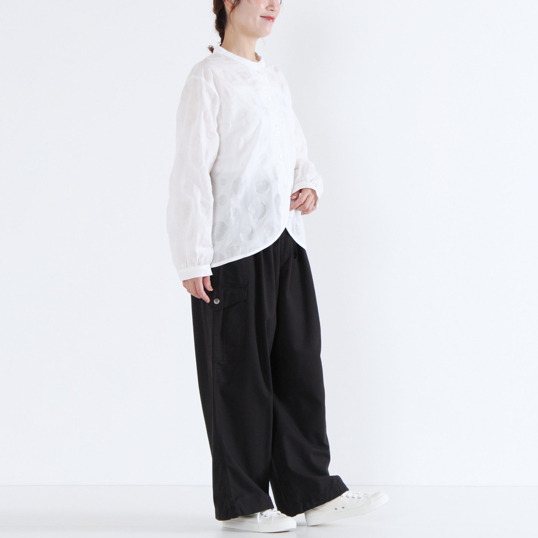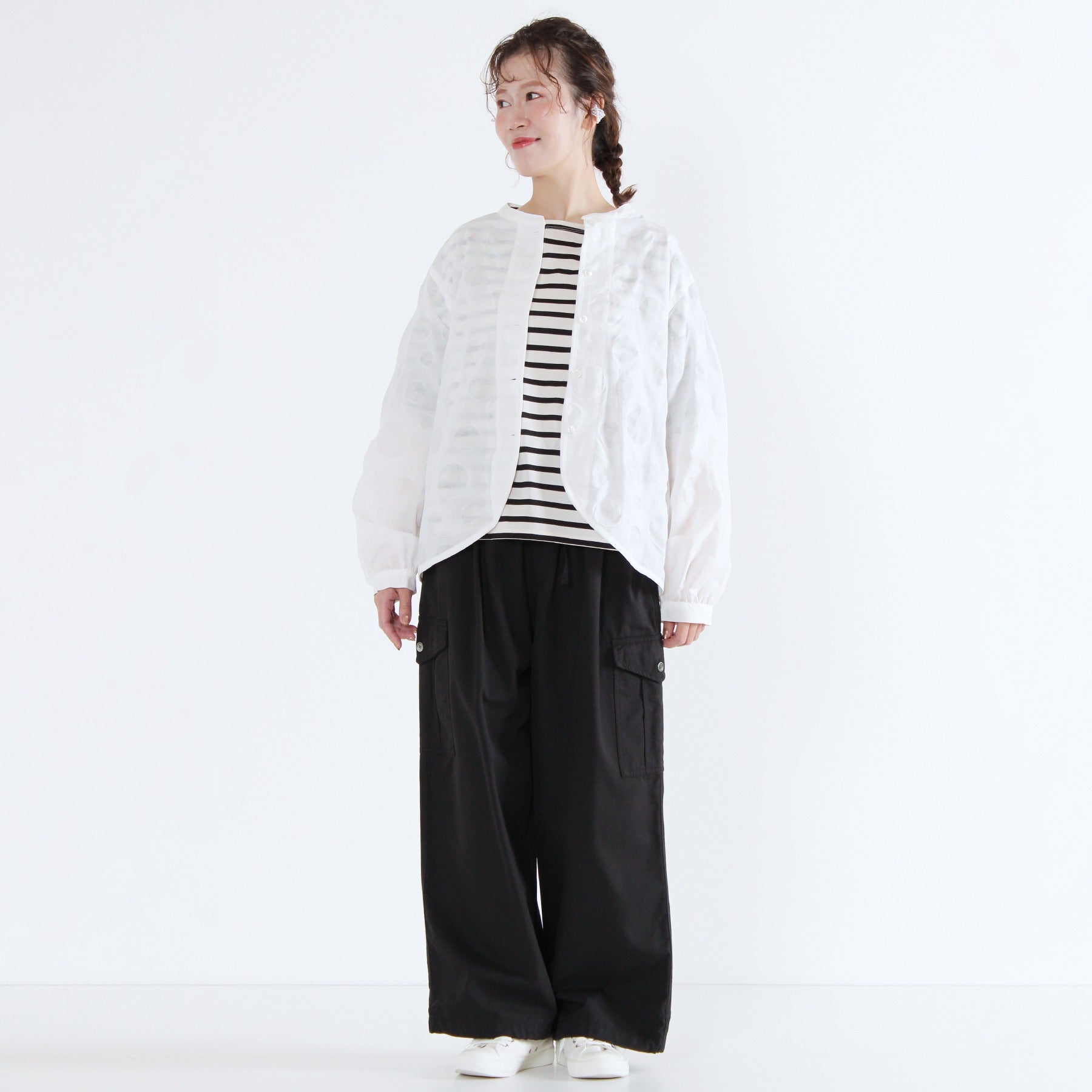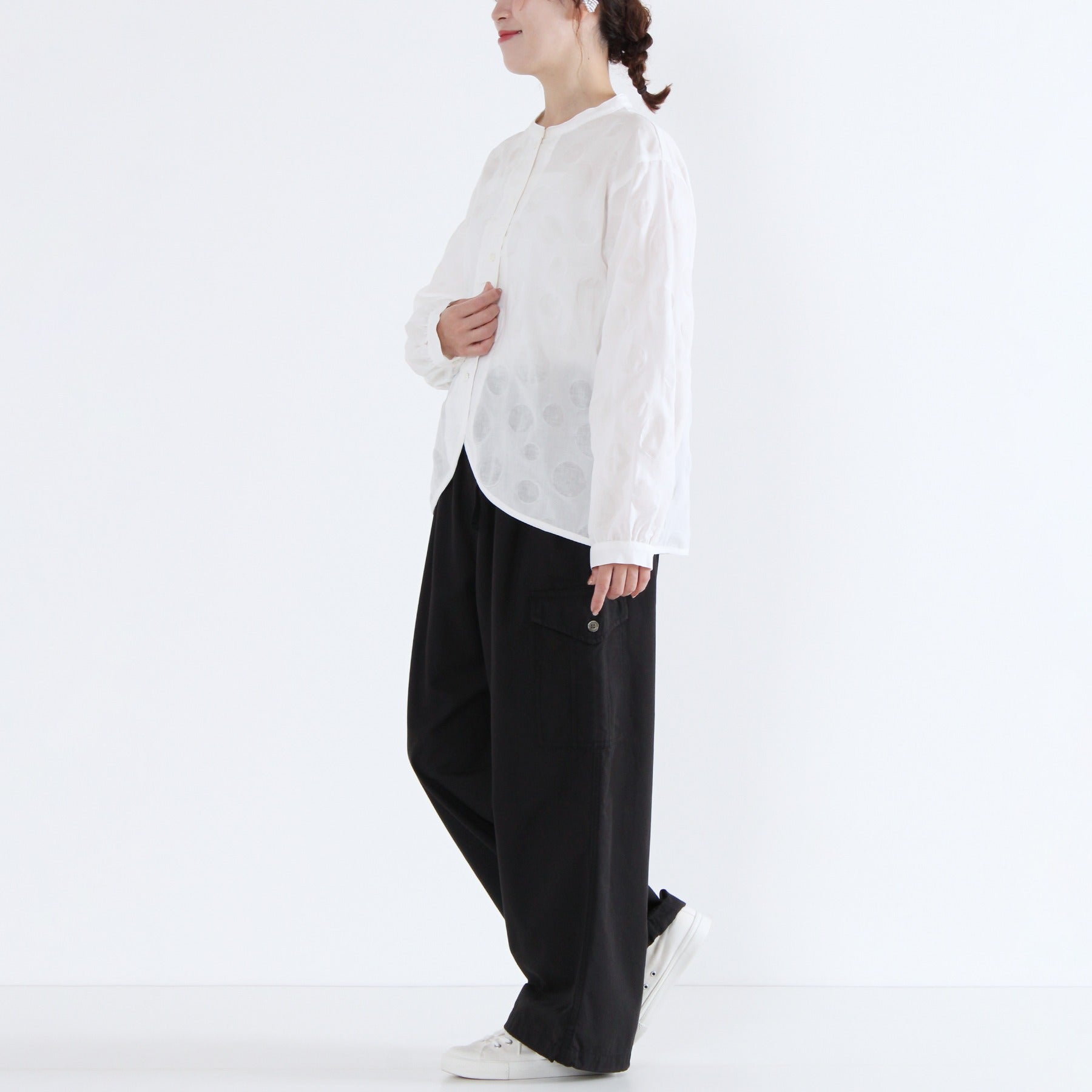 コットンリネン素材に塩縮加工を施したドット柄シャツジャケット。独特のシワ感と軽やかな風合いが魅力で、さらりと羽織れる一枚です。丸みのあるシルエットと小ぶりな襟が女性らしさを演出。前開き仕様で、インナーとのレイヤードも楽しめます。