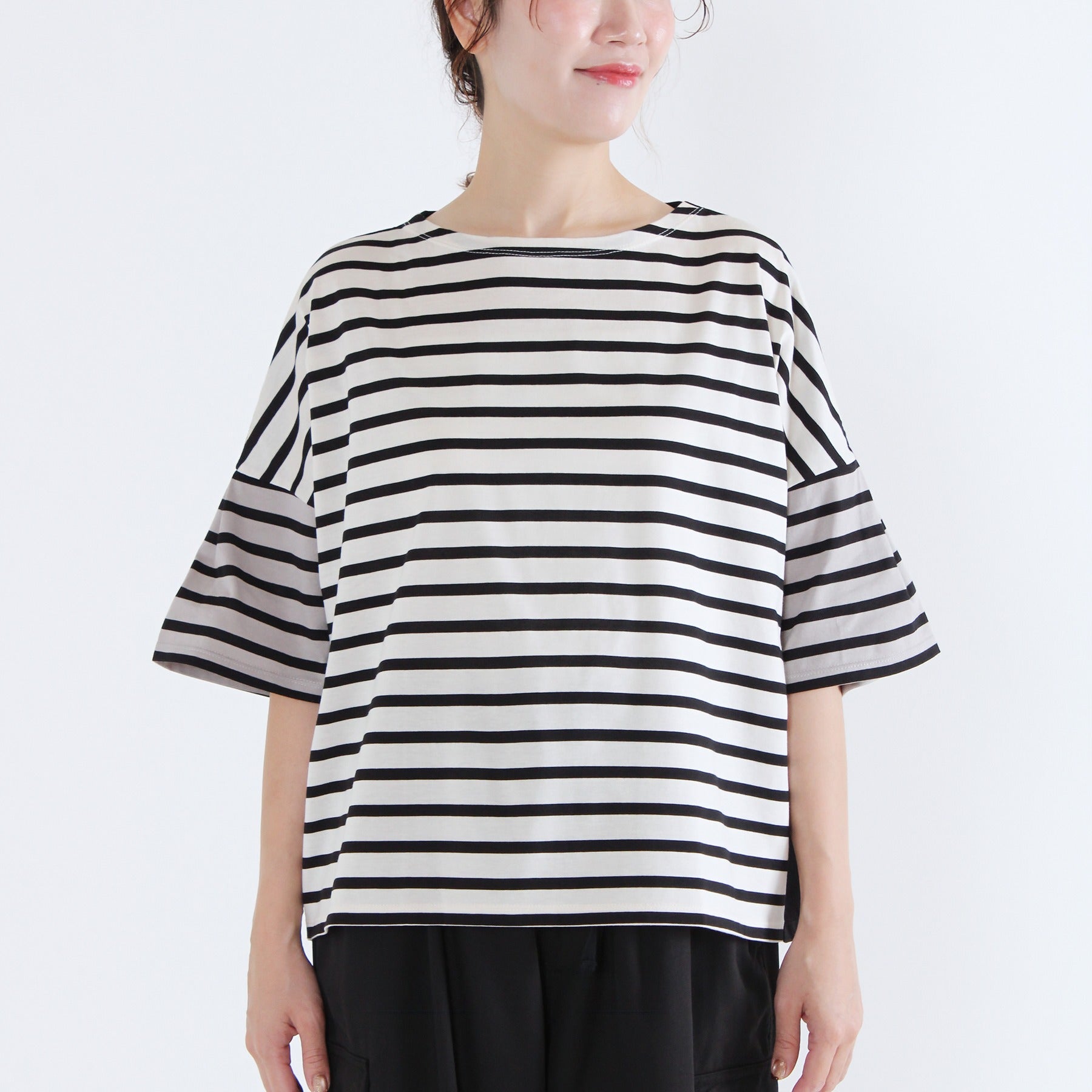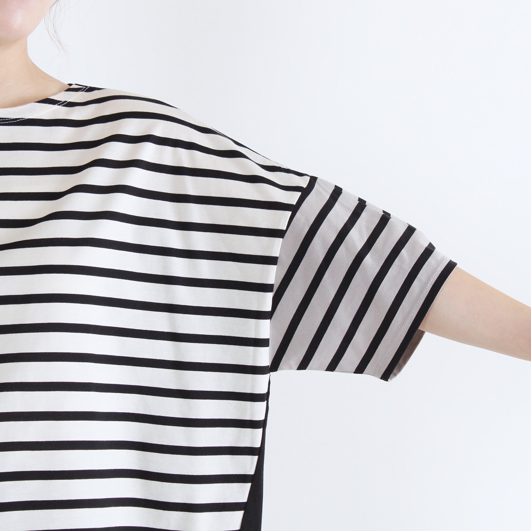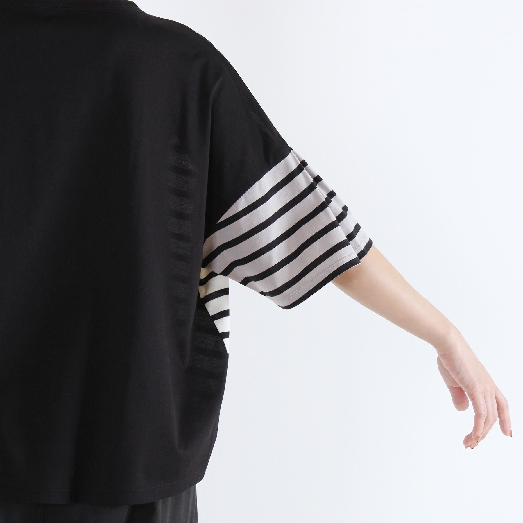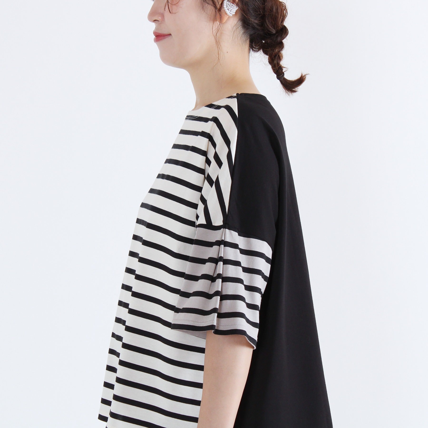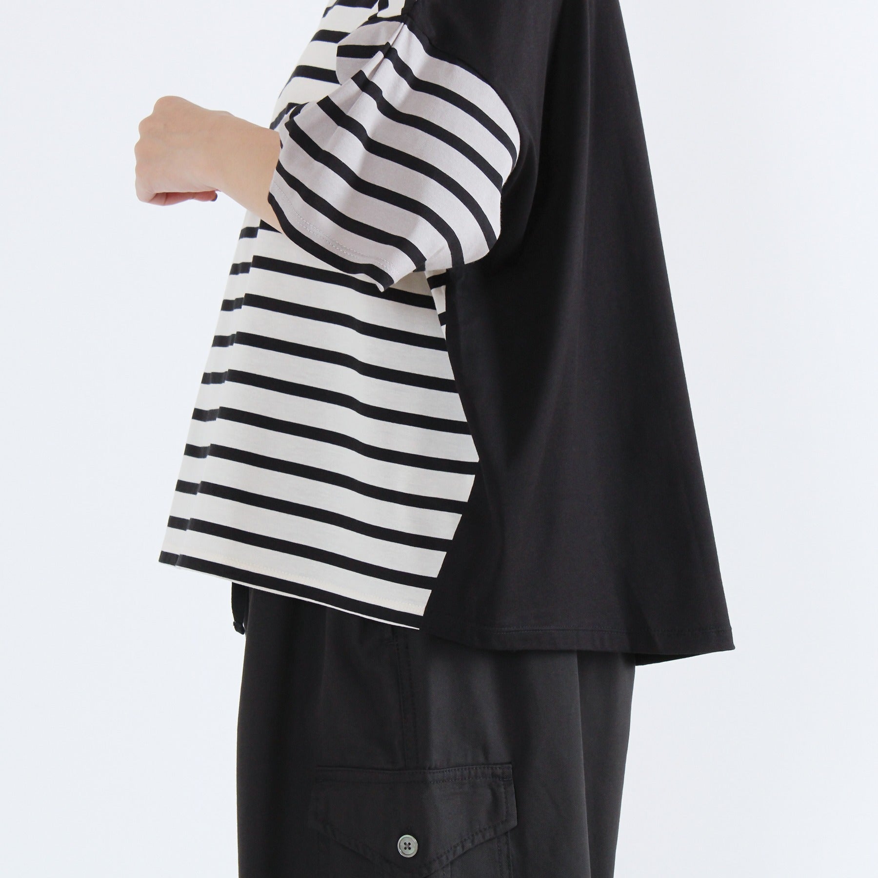 前後でボーダーと無地を切り替えた遊び心のあるクレイジーパターンのTシャツです。ふんわりタックスリーブが腕まわりをカバーし、1枚で着映えする日本製カットソー。タックインせずに着られる、すっきり着丈で透け感もなく、晩夏を楽しく乗り切れる優秀トップスになります。