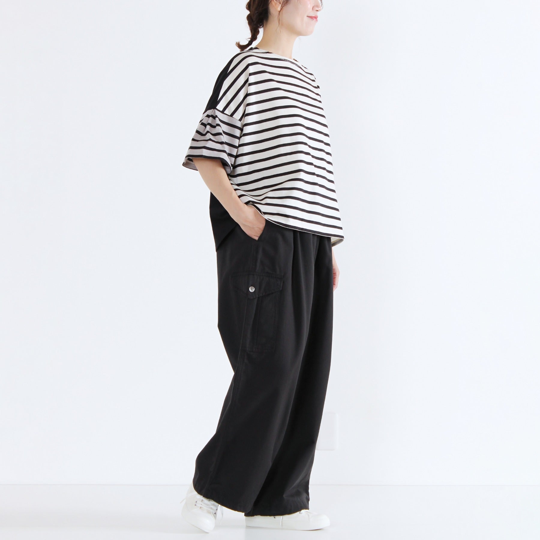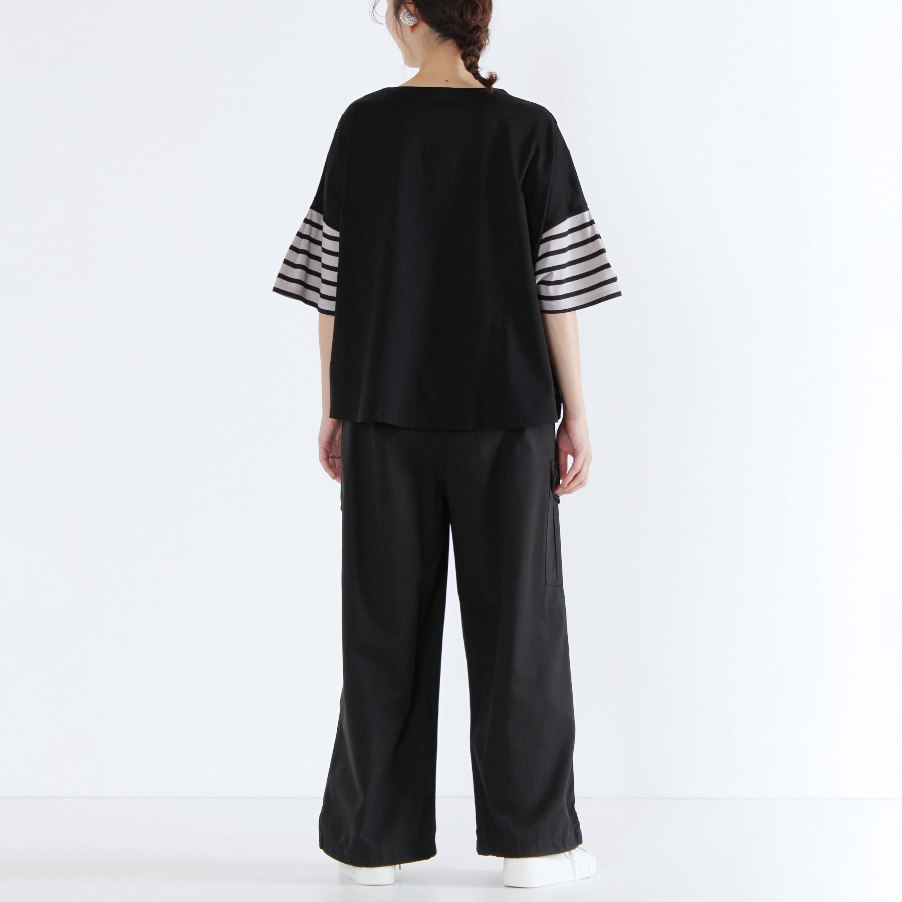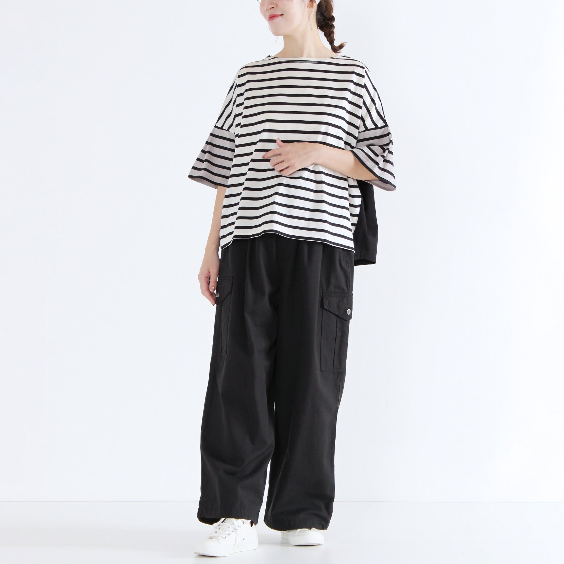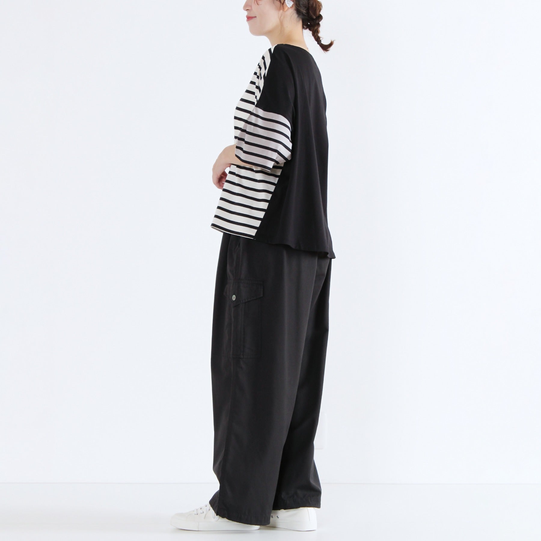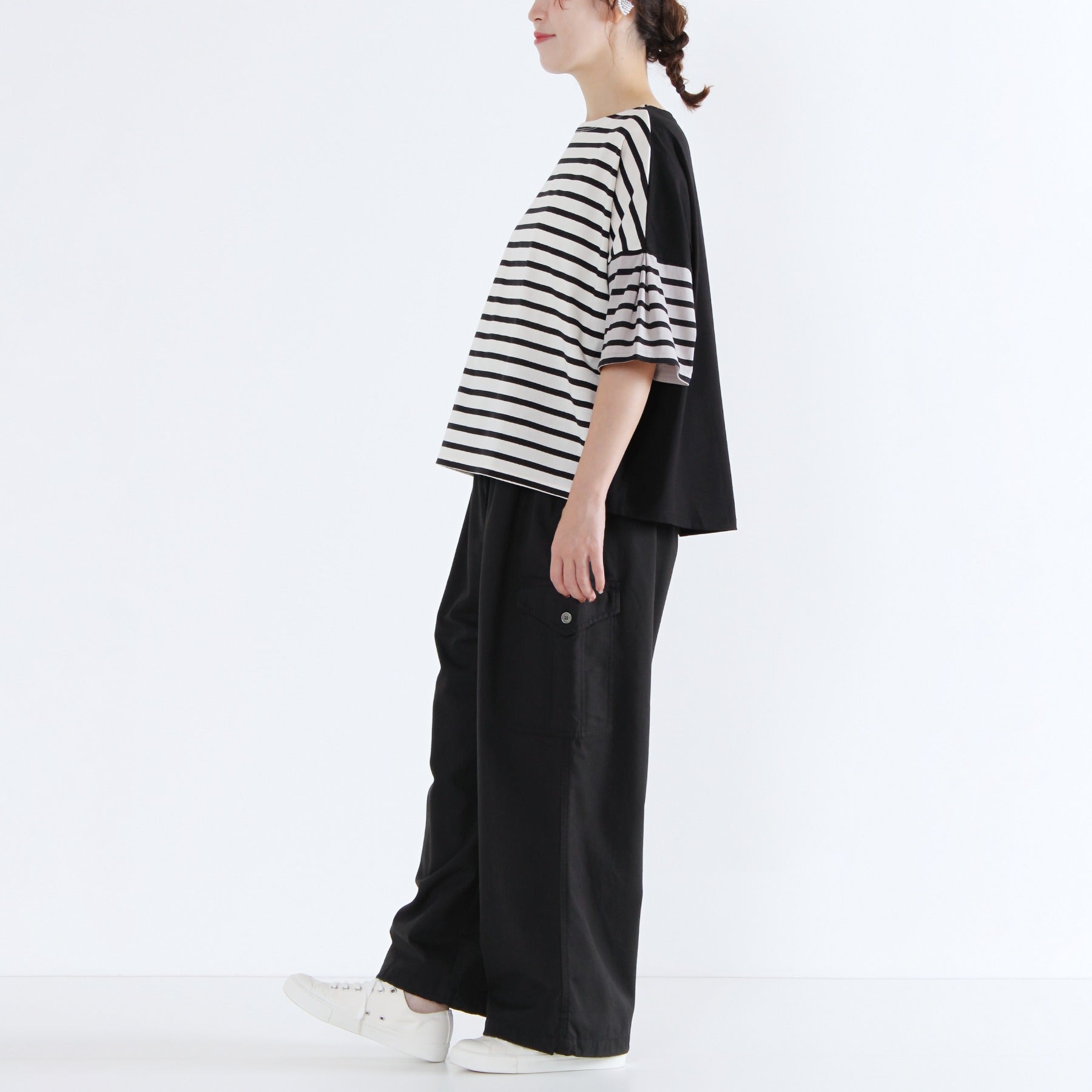 前後でボーダーと無地を切り替えた遊び心のあるクレイジーパターンのTシャツです。ふんわりタックスリーブが腕まわりをカバーし、1枚で着映えする日本製カットソー。タックインせずに着られる、すっきり着丈で透け感もなく、晩夏を楽しく乗り切れる優秀トップスになります。
